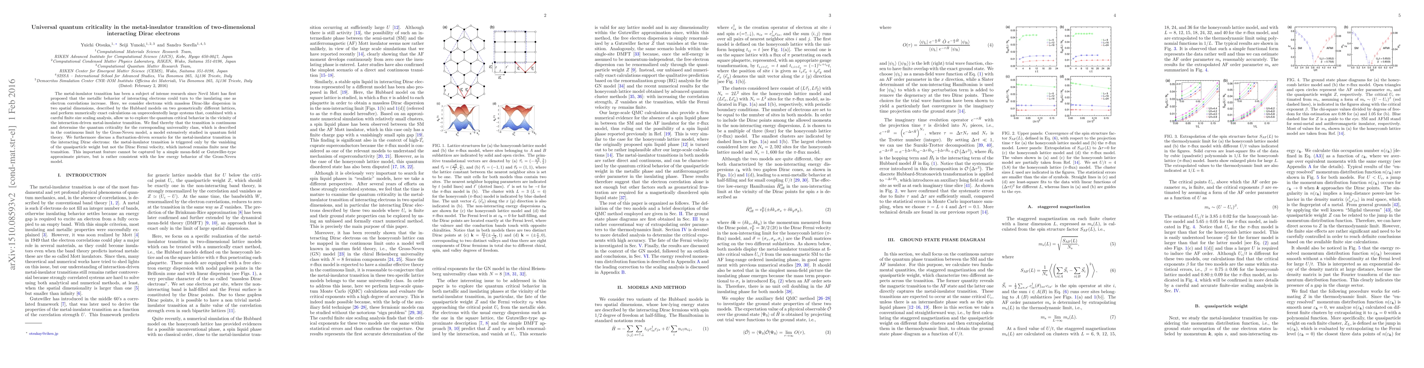 The metal-insulator transition has been a subject of intense research since Nevil Mott has first proposed that the metallic behavior of interacting electrons could turn to the insulating one as electron correlations increase. Here, we consider electrons with massless Dirac-like dispersion in two spatial dimensions, described by the Hubbard models on two geometrically different lattices, and perform numerically exact calculations on unprecedentedly large systems that, combined with a careful finite size scaling analysis, allow us to explore the quantum critical behavior in the vicinity of the interaction-driven metal-insulator transition. We find thereby that the transition is continuous and determine the quantum criticality for the corresponding universality class, which is described in the continuous limit by the Gross-Neveu model, a model extensively studied in quantum field theory. We furthermore discuss a fluctuation-driven scenario for the metal-insulator transition in the interacting Dirac electrons: the metal-insulator transition is triggered only by the vanishing of the quasiparticle weight but not the Dirac Fermi velocity, which instead remains finite near the transition. This important feature cannot be captured by a simple mean-field or Gutzwiller-type approximate picture, but is rather consistent with the low energy behavior of the Gross-Neveu model.