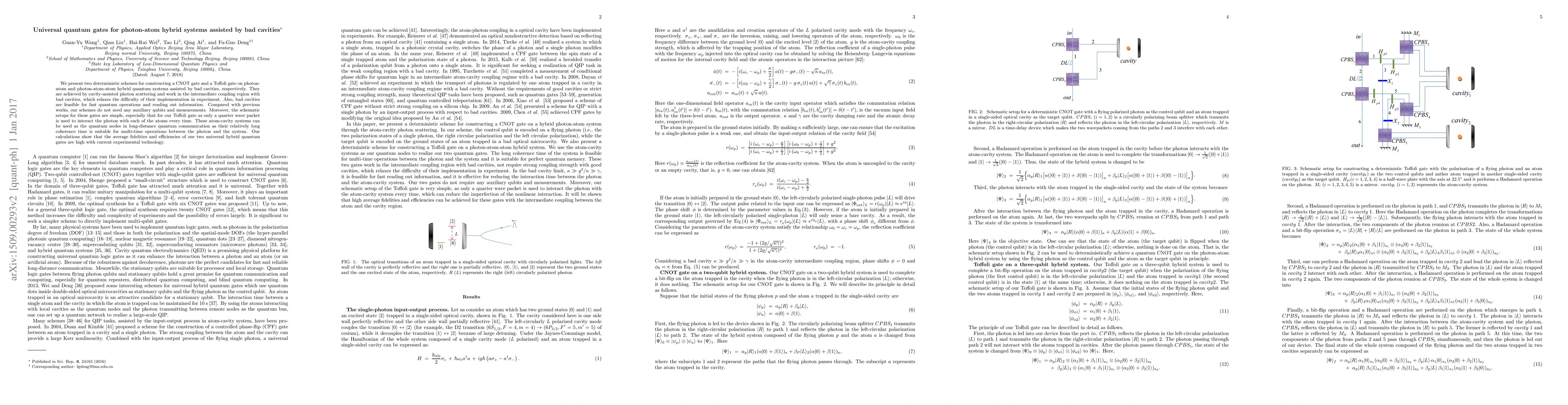 This paper proposes two deterministic schemes for constructing universal quantum gates (CNOT and Toffoli) in photon-atom hybrid systems using bad cavities, which simplifies the implementation and enhances the feasibility of long-distance quantum communication. The schemes achieve high average fidelities and efficiencies without auxiliary qubits or measurements.