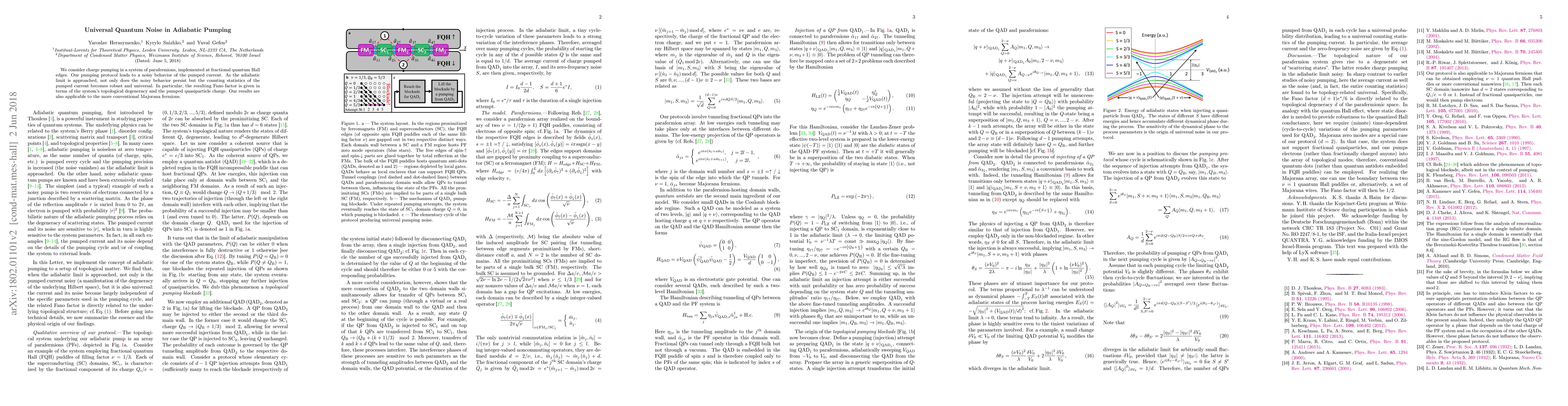 We consider charge pumping in a system of parafermions, implemented at fractional quantum Hall edges. Our pumping protocol leads to a noisy behavior of the pumped current. As the adiabatic limit is approached, not only does the noisy behavior persist but the counting statistics of the pumped current becomes robust and universal. In particular, the resulting Fano factor is given in terms of the system's topological degeneracy and the pumped quasiparticle charge. Our results are also applicable to the more conventional Majorana fermions.