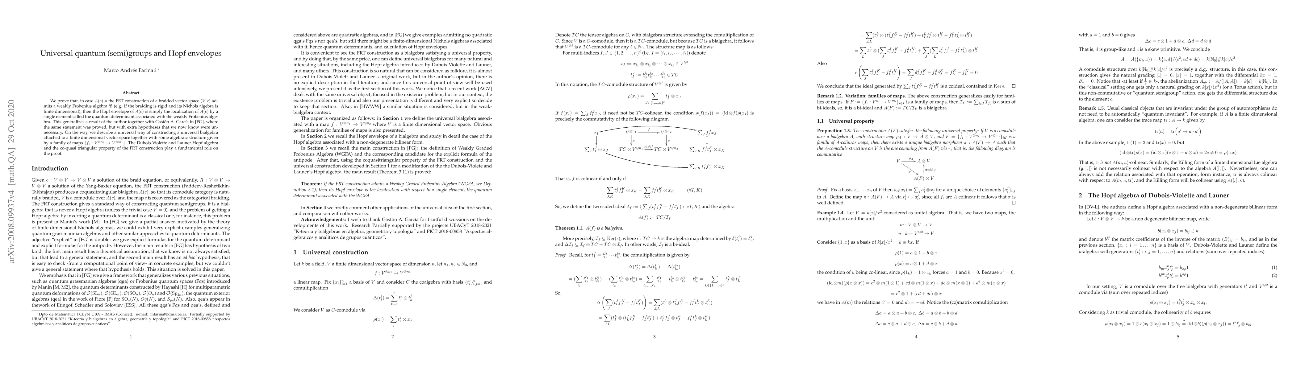 We prove that, in case $A(c)$ = the FRT construction of a braided vector space $(V,c)$ admits a weakly Frobenius algebra $\mathfrak B$ (e.g. if the braiding is rigid and its Nichols algebra is finite dimensional), then the Hopf envelope of $A(c)$ is simply the localization of $A(c)$ by a single element called the quantum determinant associated to the weakly Frobenius algebra. This generalizes a result of the author together with Gast\'on A. Garc\'ia in \cite{FG}, where the same statement was proved, but with extra hypotheses that we now know were unnecessary. On the way, we describe a universal way of constructing a universal bialgebra attached to a finite dimensional vector space together with some algebraic structure given by a family of maps $\{f_i:V^{\otimes n_i}\to V^{\otimes m_i}\}$. The Dubois-Violette and Launer Hopf algebra and the co-quasi triangular property of the FRT construction play a fundamental role on the proof.