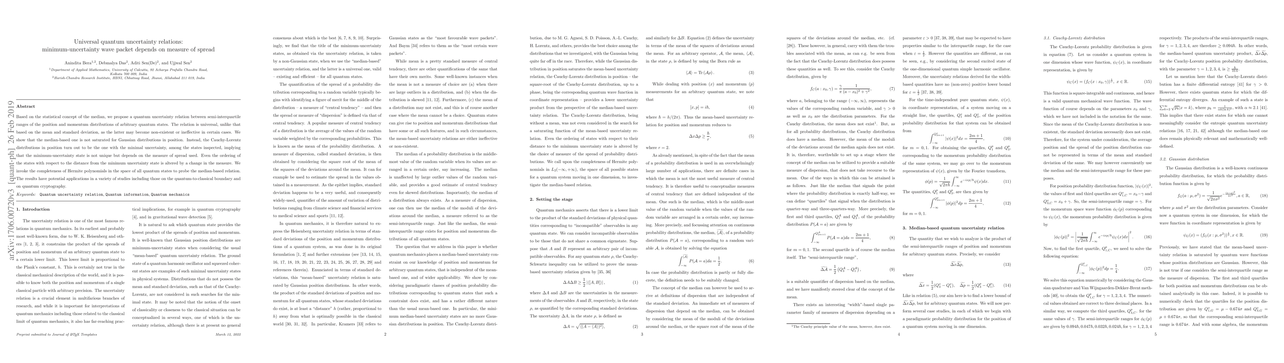 Based on the statistical concept of the median, we propose a quantum uncertainty relation between semi-interquartile ranges of the position and momentum distributions of arbitrary quantum states. The relation is universal, unlike that based on the mean and standard deviation, as the latter may become non-existent or ineffective in certain cases. We show that the median-based one is not saturated for Gaussian distributions in position. Instead, the Cauchy-Lorentz distributions in position turn out to be the one with the minimal uncertainty, among the states inspected, implying that the minimum-uncertainty state is not unique but depends on the measure of spread used. Even the ordering of the states with respect to the distance from the minimum uncertainty state is altered by a change in the measure. We invoke the completeness of Hermite polynomials in the space of all quantum states to probe the median-based relation. The results have potential applications in a variety of studies including those on the quantum-to-classical boundary and on quantum cryptography.