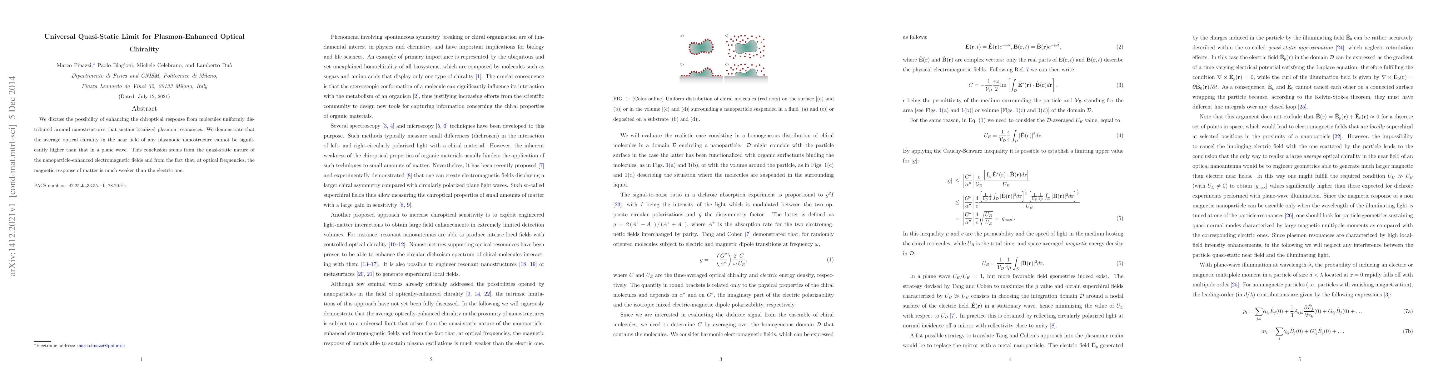 We discuss the possibility of enhancing the chiroptical response from molecules uniformly distributed around nanostructures that sustain localized plasmon resonances. We demonstrate that the average optical chirality in the near field of any plasmonic nanostrucure cannot be significantly higher than that in a plane wave. This conclusion stems from the quasi-static nature of the nanoparticle-enhanced electromagnetic fields and from the fact that, at optical frequencies, the magnetic response of matter is much weaker than the electric one.