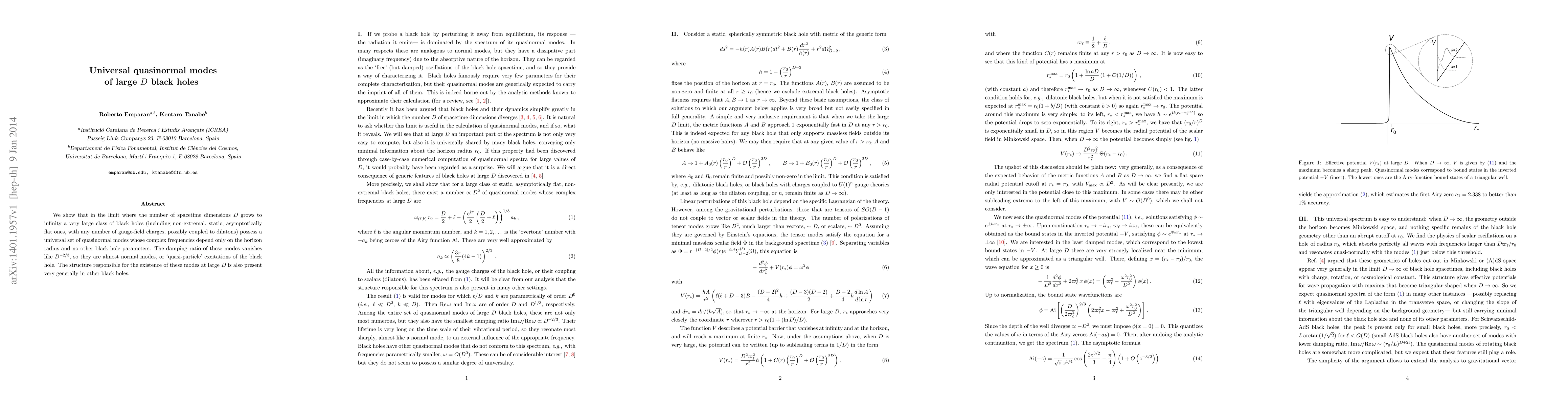 We show that in the limit where the number of spacetime dimensions D grows to infinity a very large class of black holes (including non-extremal, static, asymptotically flat ones, with any number of gauge-field charges, possibly coupled to dilatons) possess a universal set of quasinormal modes whose complex frequencies depend only on the horizon radius and no other black hole parameters. The damping ratio of these modes vanishes like $D^{-2/3}$, so they are almost normal modes, or 'quasi-particle' excitations of the black hole. The structure responsible for the existence of these modes at large D is also present very generally in other black holes.