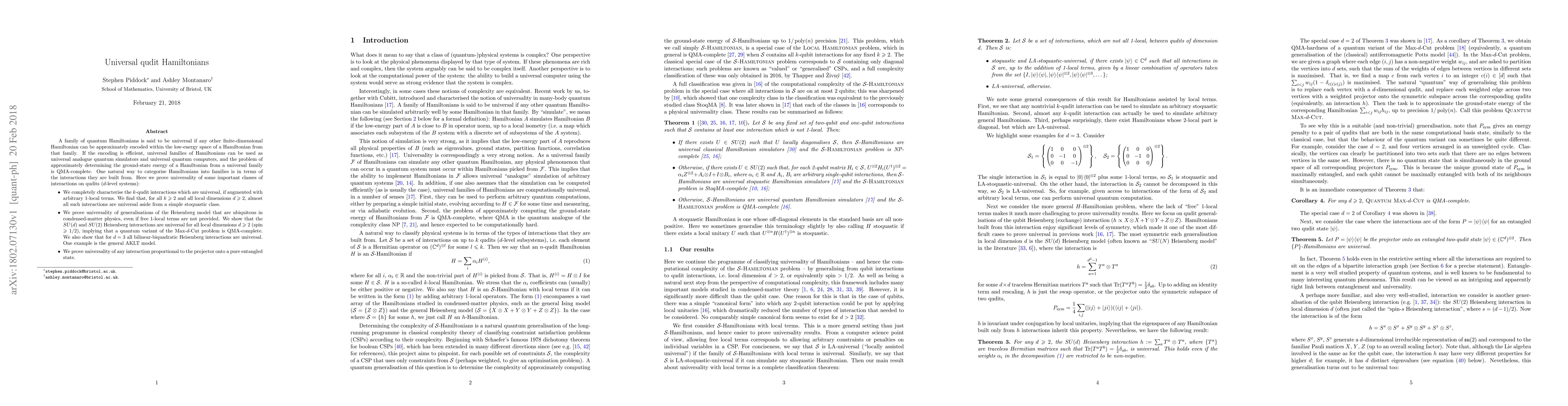 A family of quantum Hamiltonians is said to be universal if any other finite-dimensional Hamiltonian can be approximately encoded within the low-energy space of a Hamiltonian from that family. If the encoding is efficient, universal families of Hamiltonians can be used as universal analogue quantum simulators and universal quantum computers, and the problem of approximately determining the ground-state energy of a Hamiltonian from a universal family is QMA-complete. One natural way to categorise Hamiltonians into families is in terms of the interactions they are built from. Here we prove universality of some important classes of interactions on qudits ($d$-level systems): (1) We completely characterise the $k$-qudit interactions which are universal, if augmented with arbitrary 1-local terms. We find that, for all $k \geqslant 2$ and all local dimensions $d \geqslant 2$, almost all such interactions are universal aside from a simple stoquastic class. (2) We prove universality of generalisations of the Heisenberg model that are ubiquitous in condensed-matter physics, even if free 1-local terms are not provided. We show that the $SU(d)$ and $SU(2)$ Heisenberg interactions are universal for all local dimensions $d \geqslant 2$ (spin $\geqslant 1/2$), implying that a quantum variant of the Max-$d$-Cut problem is QMA-complete. We also show that for $d=3$ all bilinear-biquadratic Heisenberg interactions are universal. One example is the general AKLT model. (3) We prove universality of any interaction proportional to the projector onto a pure entangled state.