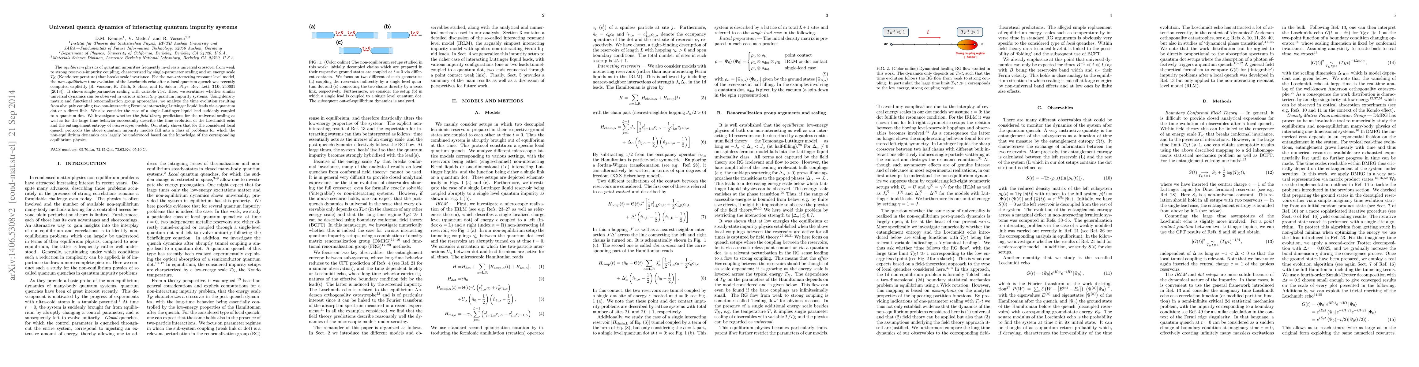 The equilibrium physics of quantum impurities frequently involves a universal crossover from weak to strong reservoir-impurity coupling, characterized by single-parameter scaling and an energy scale $T_K$ (Kondo temperature) that breaks scale invariance. For the non-interacting resonant level model, the non-equilibrium time evolution of the Loschmidt echo after a local quantum quench was recently computed explicitely [R. Vasseur, K. Trinh, S. Haas, and H. Saleur, Phys. Rev. Lett. 110, 240601 (2013)]. It shows single-parameter scaling with variable $T_K t$. Here, we scrutinize whether similar universal dynamics can be observed in various interacting quantum impurity systems. Using density matrix and functional renormalization group approaches, we analyze the time evolution resulting from abruptly coupling two non-interacting Fermi or interacting Luttinger liquid leads via a quantum dot or a direct link. We also consider the case of a single Luttinger liquid lead suddenly coupled to a quantum dot. We investigate whether the field theory predictions for the universal scaling as well as for the large time behavior successfully describe the time evolution of the Loschmidt echo and the entanglement entropy of microscopic models.