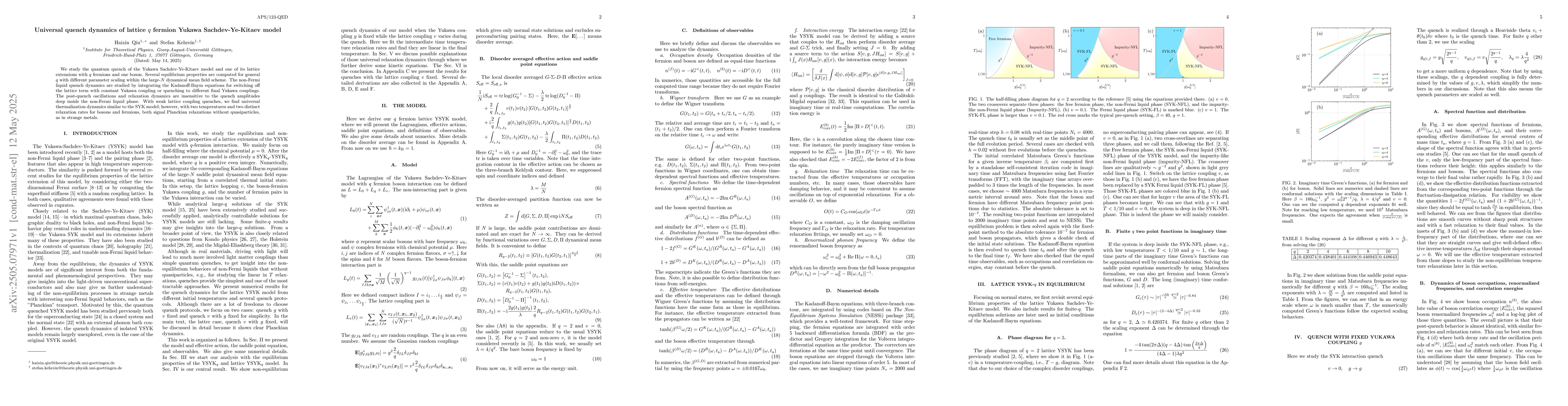 This study contributes to understanding the universal quench dynamics in the lattice $q$ fermion Yukawa Sachdev-Ye-Kitaev model, providing insights into non-Fermi liquid behavior and thermalization in strange metals.