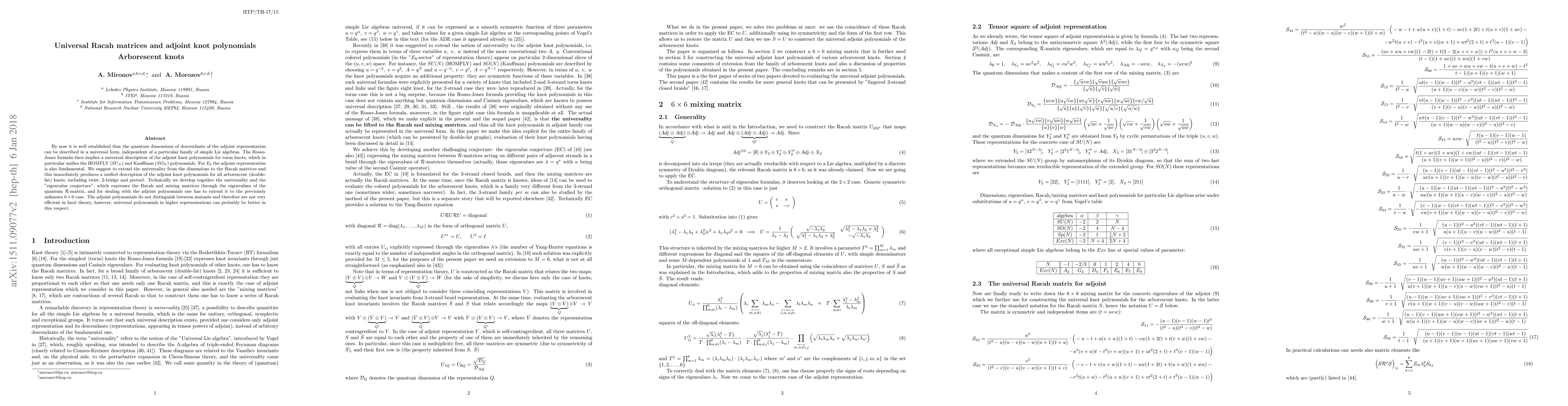 The construction of the universal Racah matrices and their application to calculate adjoint knot polynomials was a major technical contribution of this research.