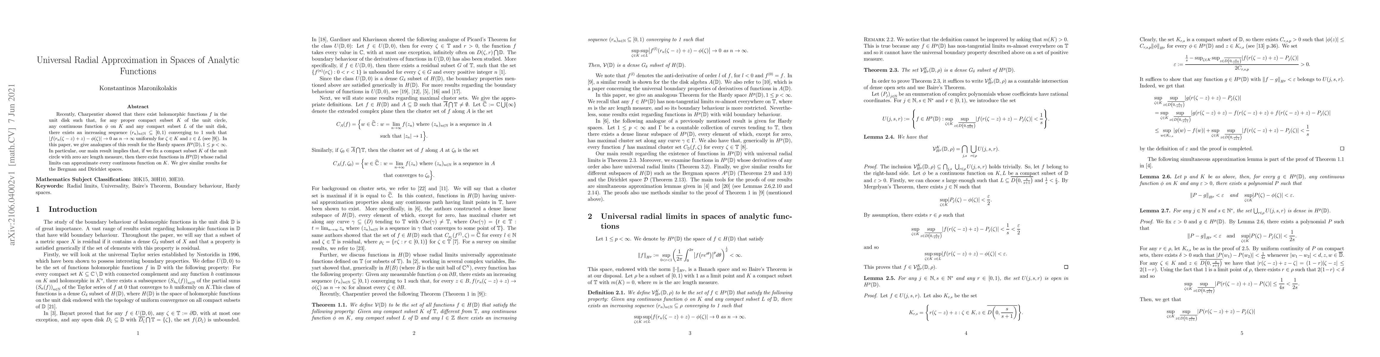 Recently, Charpentier showed that there exist holomorphic functions $f$ in the unit disk such that, for any proper compact subset $K$ of the unit circle, any continuous function $\phi$ on $K$ and any compact subset $L$ of the unit disk, there exists an increasing sequence $(r_n)_{n\in\mathbb{N}}\subseteq[0,1)$ converging to 1 such that $|f(r_n(\zeta-z)+z)-\phi(\zeta)|\to0$ as $n\to\infty$ uniformly for $\zeta\in K$ and $z\in L$. In this paper, we give analogues of this result for the Hardy spaces $H^p(\mathbb{D}),1\leq p<\infty$. In particular, our main result implies that, if we fix a compact subset $K$ of the unit circle with zero arc length measure, then there exist functions in $H^p(\mathbb{D})$ whose radial limits can approximate every continuous function on $K$. We give similar results for the Bergman and Dirichlet spaces.