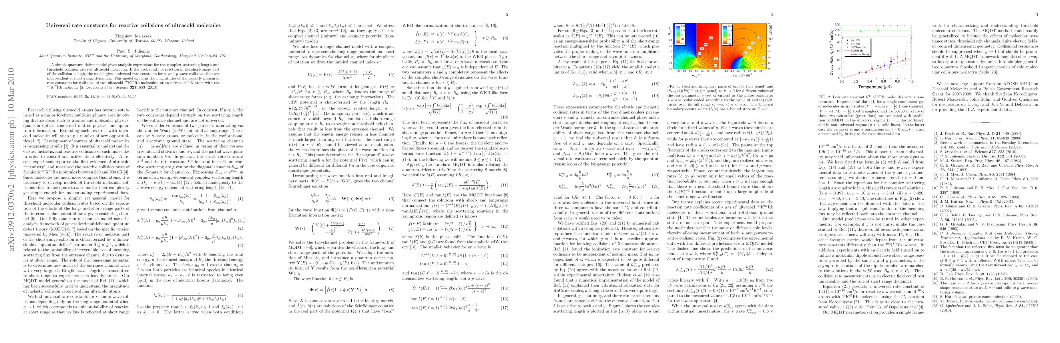 This paper presents a quantum defect model that provides analytic expressions for the scattering length and collision rates of ultracold molecules, yielding universal rate constants that are independent of short-range dynamics, which explains recent measurements of collision rates for ultracold 40K87Rb molecules.