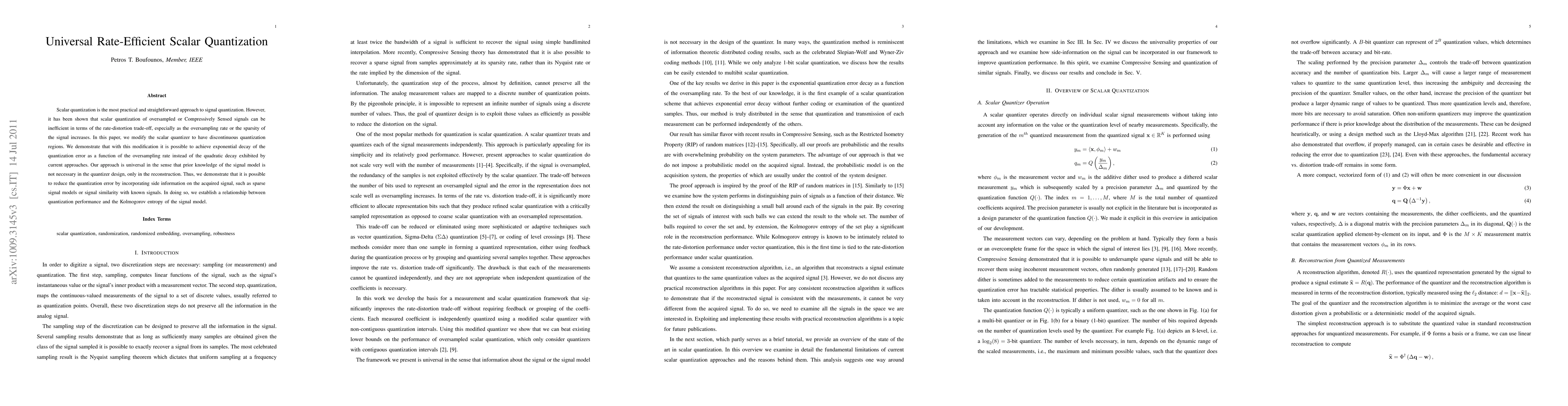 This paper proposes a modified scalar quantizer with discontinuous quantization regions to achieve exponential decay of quantization error with oversampling rate, improving the rate-distortion trade-off for oversampled or compressed signals. The approach is universal, requiring no prior signal model knowledge in quantizer design, only for reconstruction.