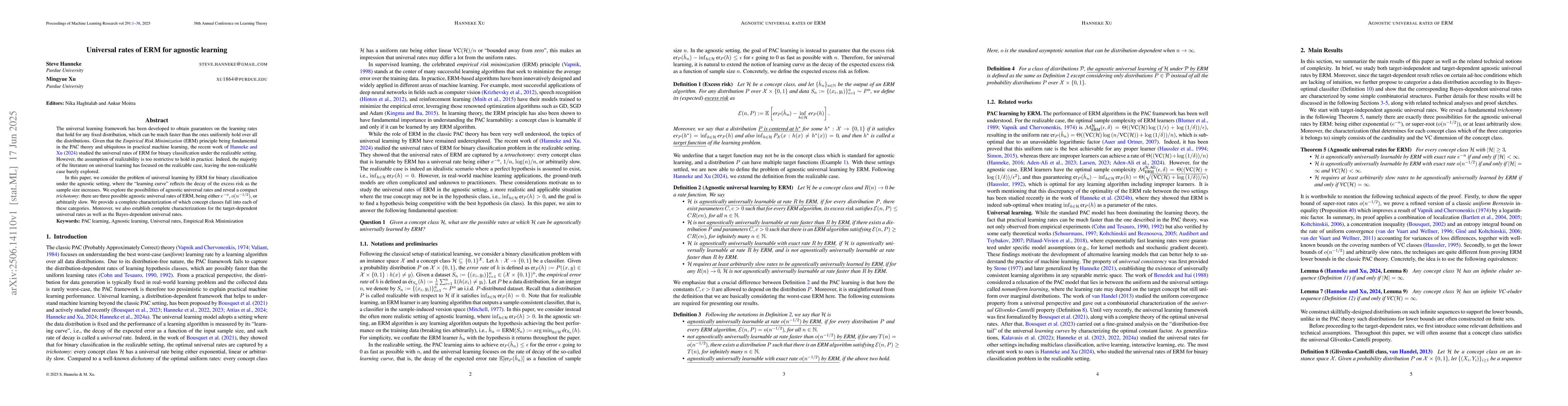 The universal learning framework has been developed to obtain guarantees on the learning rates that hold for any fixed distribution, which can be much faster than the ones uniformly hold over all the distributions. Given that the Empirical Risk Minimization (ERM) principle being fundamental in the PAC theory and ubiquitous in practical machine learning, the recent work of arXiv:2412.02810 studied the universal rates of ERM for binary classification under the realizable setting. However, the assumption of realizability is too restrictive to hold in practice. Indeed, the majority of the literature on universal learning has focused on the realizable case, leaving the non-realizable case barely explored. In this paper, we consider the problem of universal learning by ERM for binary classification under the agnostic setting, where the ''learning curve" reflects the decay of the excess risk as the sample size increases. We explore the possibilities of agnostic universal rates and reveal a compact trichotomy: there are three possible agnostic universal rates of ERM, being either $e^{-n}$, $o(n^{-1/2})$, or arbitrarily slow. We provide a complete characterization of which concept classes fall into each of these categories. Moreover, we also establish complete characterizations for the target-dependent universal rates as well as the Bayes-dependent universal rates.
