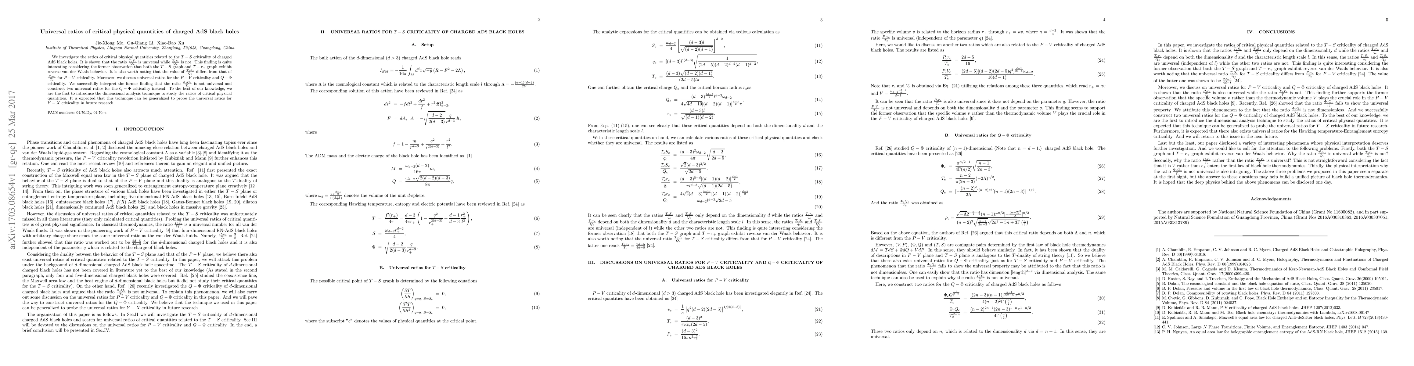 We investigate the ratios of critical physical quantities related to the $T-S$ criticality of charged AdS black holes. It is shown that the ratio $\frac{T_cS_c}{Q_c}$ is universal while $\frac{T_cr_c}{Q_c}$ is not. This finding is quite interesting considering the former observation that both the $T-S$ graph and $T-r_+$ graph exhibit reverse van der Waals behavior. It is also worth noting that the value of $\frac{T_cS_c}{Q_c}$ differs from that of $\frac{P_cv_c}{T_c}$ for $P-V$ criticality. Moreover, we discuss universal ratios for the $P-V$ criticality and $Q-\Phi$ criticality. We successfully interpret the former finding that the ratio $\frac{\Phi_cQ_c}{T_c}$ is not universal and construct two universal ratios for the $Q-\Phi$ criticality instead. To the best of our knowledge, we are the first to introduce the dimensional analysis technique to study the ratios of critical physical quantities. It is expected that this technique can be generalized to probe the universal ratios for $Y-X$ criticality in future research.