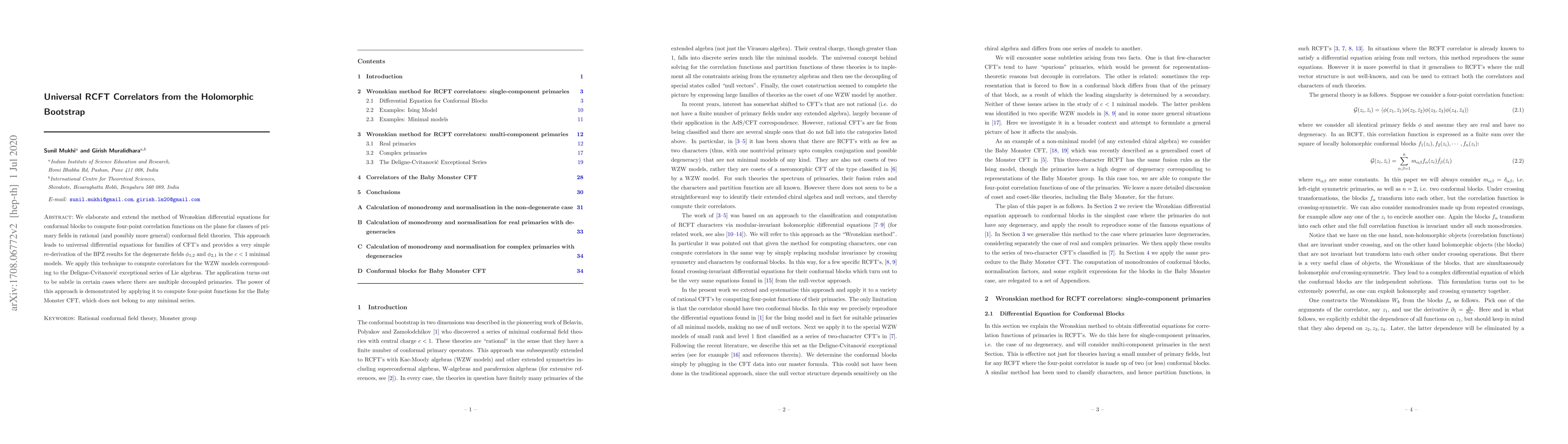 We elaborate and extend the method of Wronskian differential equations for conformal blocks to compute four-point correlation functions on the plane for classes of primary fields in rational (and possibly more general) conformal field theories. This approach leads to universal differential equations for families of CFT's and provides a very simple re-derivation of the BPZ results for the degenerate fields $\phi_{1,2}$ and $\phi_{2,1}$ in the c < 1 minimal models. We apply this technique to compute correlators for the WZW models corresponding to the Deligne-Cvitanovi\'c exceptional series of Lie algebras. The application turns out to be subtle in certain cases where there are multiple decoupled primaries. The power of this approach is demonstrated by applying it to compute four-point functions for the Baby Monster CFT, which does not belong to any minimal series.