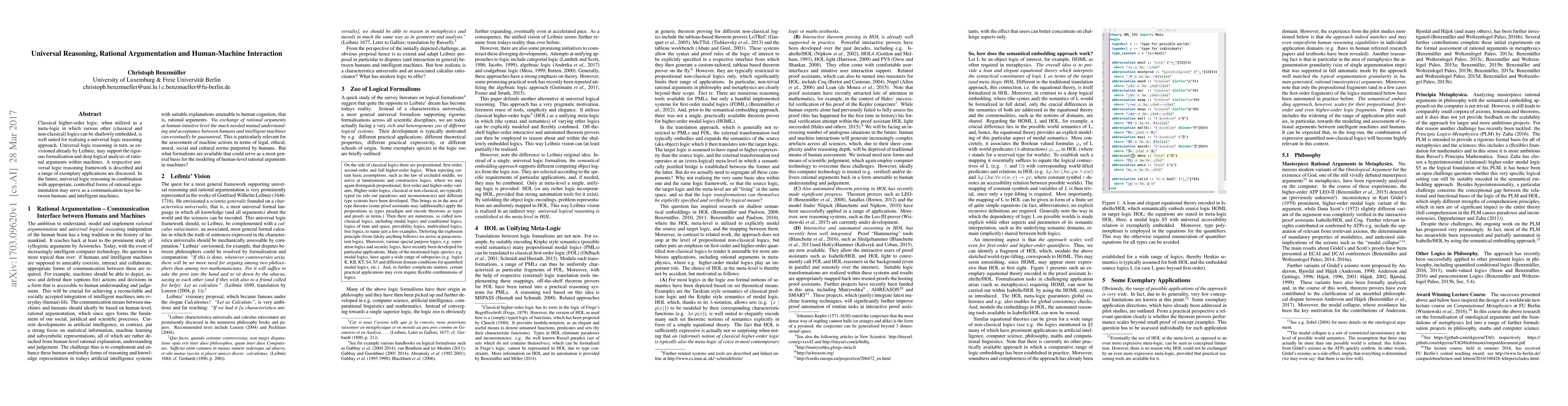 The paper proposes classical higher-order logic as a meta-logic to formalize and analyze rational arguments within machines, potentially serving as a universal reasoning framework. Future applications may leverage this framework for improved human-machine interaction through rational argumentation.
