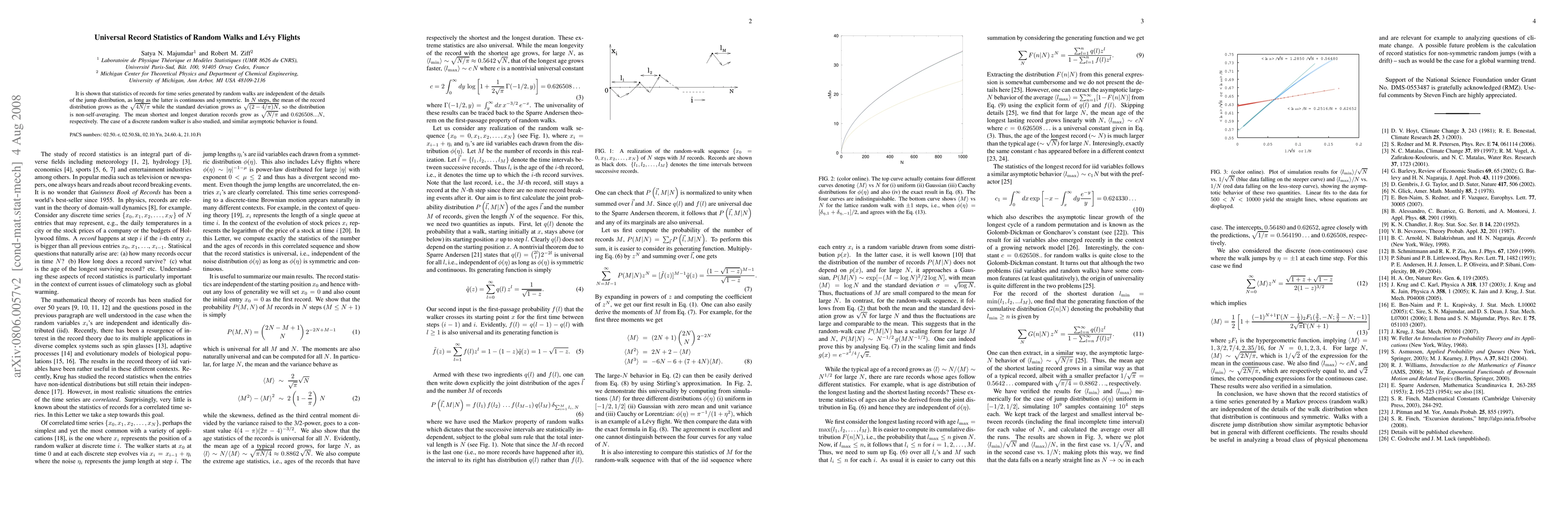 This paper investigates the universal record statistics of random walks and Lévy flights, demonstrating that record statistics are unaffected by continuous, symmetric jump distributions. The mean record distribution scales as sqrt(4N/pi) with N steps, and the standard deviation as sqrt((2-4/pi)N), indicating non-self-averaging behavior.