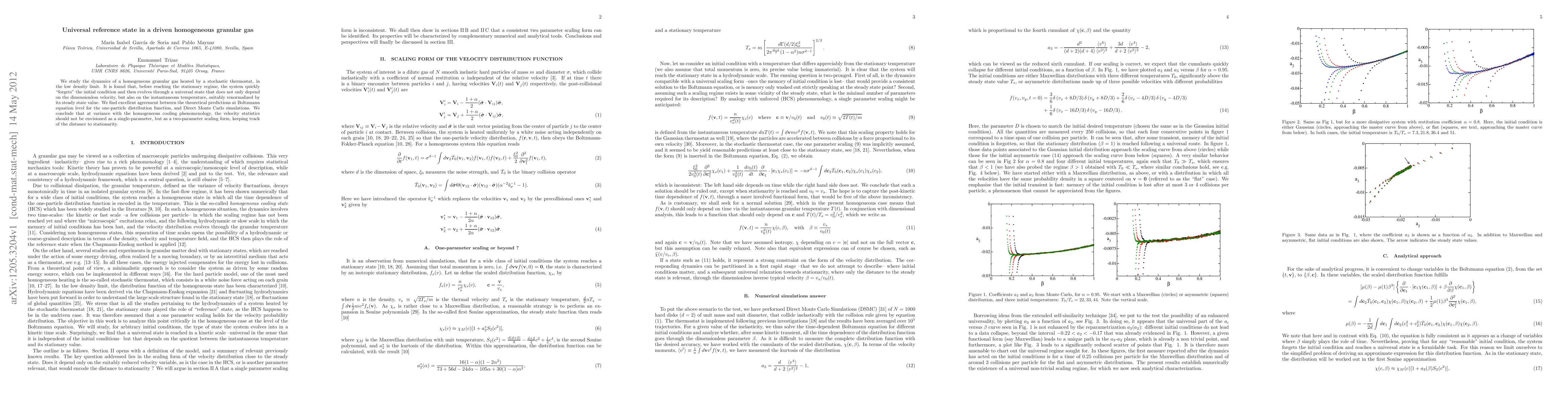 This paper investigates the dynamics of a driven granular gas, revealing that it passes through a universal reference state before reaching equilibrium. This state depends on both dimensionless velocity and temperature, renormalized by the steady-state value, challenging the traditional single-parameter scaling of velocity statistics.