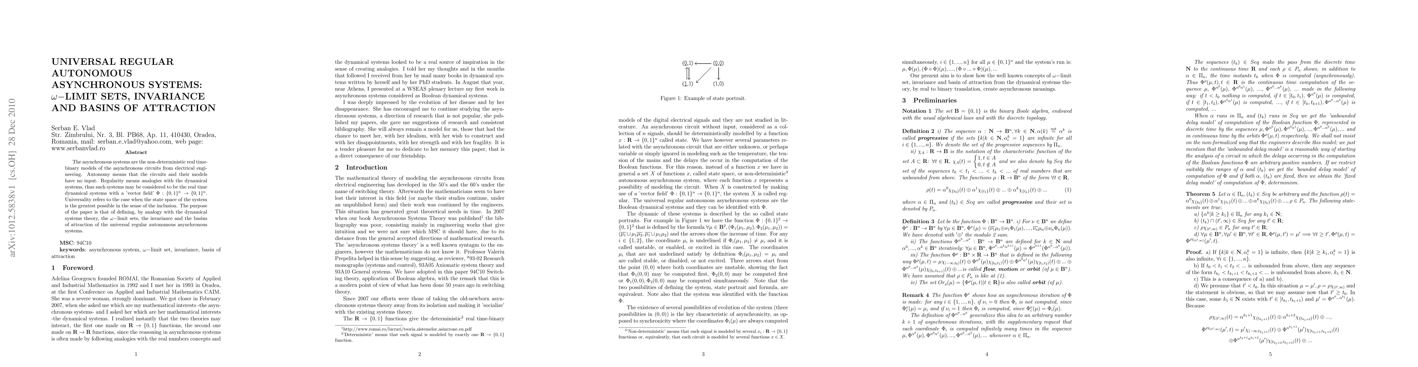 The asynchronous systems are the non-deterministic real time-binary models of the asynchronous circuits from electrical engineering. Autonomy means that the circuits and their models have no input. Regularity means analogies with the dynamical systems, thus such systems may be considered to be the real time dynamical systems with a 'vector field' {\Phi}:{0,1}^2 \rightarrow {0,1}^2. Universality refers to the case when the state space of the system is the greatest possible in the sense of the inclusion. The purpose of the paper is that of defining, by analogy with the dynamical systems theory, the {\omega}-limit sets, the invariance and the basins of attraction of the universal regular autonomous asynchronous systems.