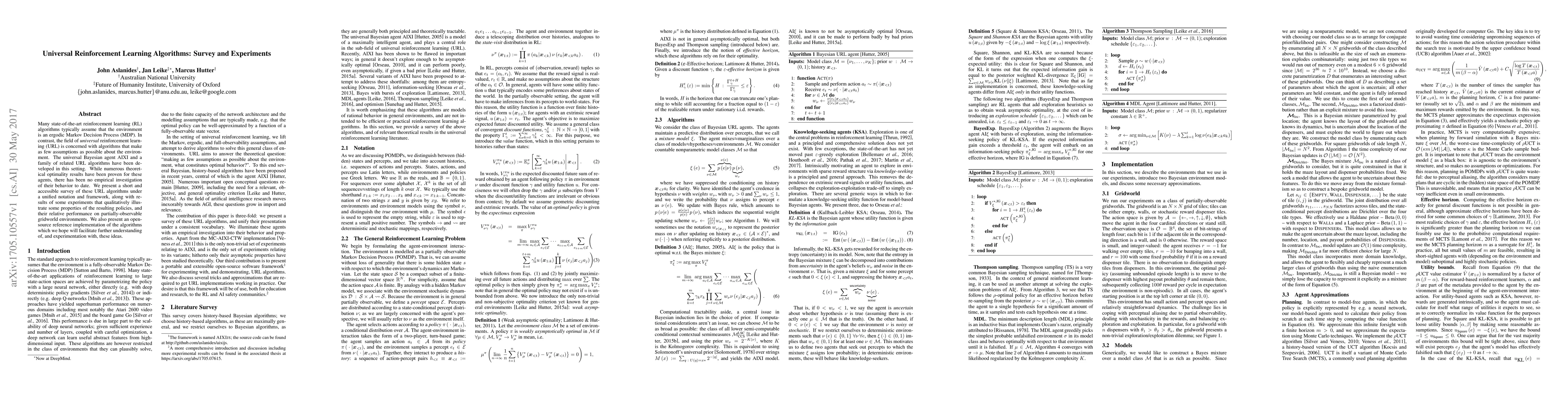 This paper surveys universal reinforcement learning (URL) algorithms, which make minimal assumptions about environments, focusing on the theoretical agent AIXI and related methods. It presents a unified framework, experimental results showing policy properties and performance on gridworld tasks, along with an open-source implementation for further study.