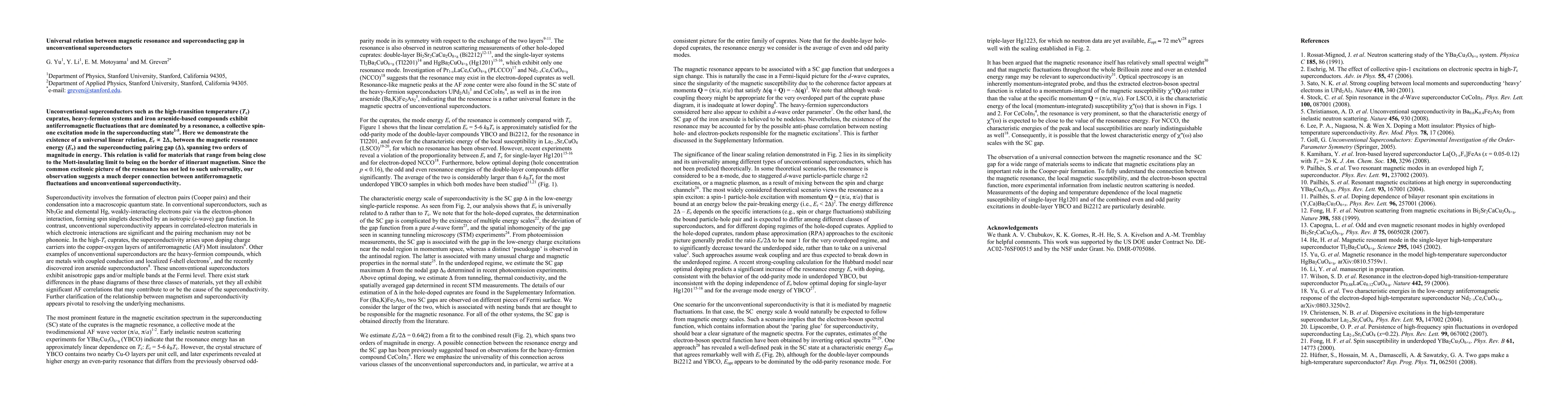 This paper establishes a universal linear relation between the magnetic resonance energy and the superconducting pairing gap in unconventional superconductors, suggesting a profound connection between antiferromagnetic fluctuations and superconductivity beyond the conventional excitonic picture.