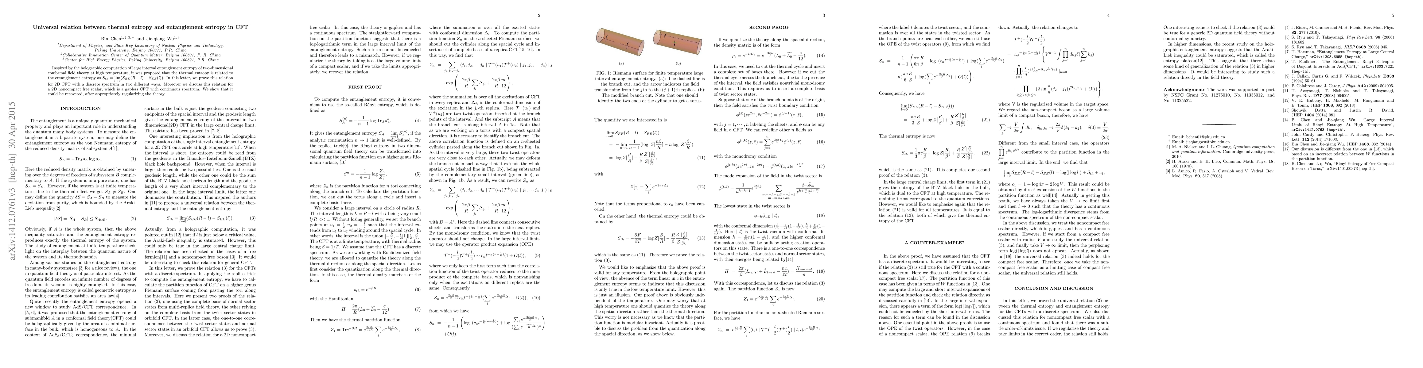 This paper proves a universal relation between thermal entropy and entanglement entropy in 2D conformal field theories (CFTs), specifically showing that $S_{th}=\lim_{l \to 0}(S_{EE}(R-l)-S_{EE}(l))$ for CFTs with discrete spectra. It also extends this relation to a gapless CFT with continuous spectrum, after proper regularization.