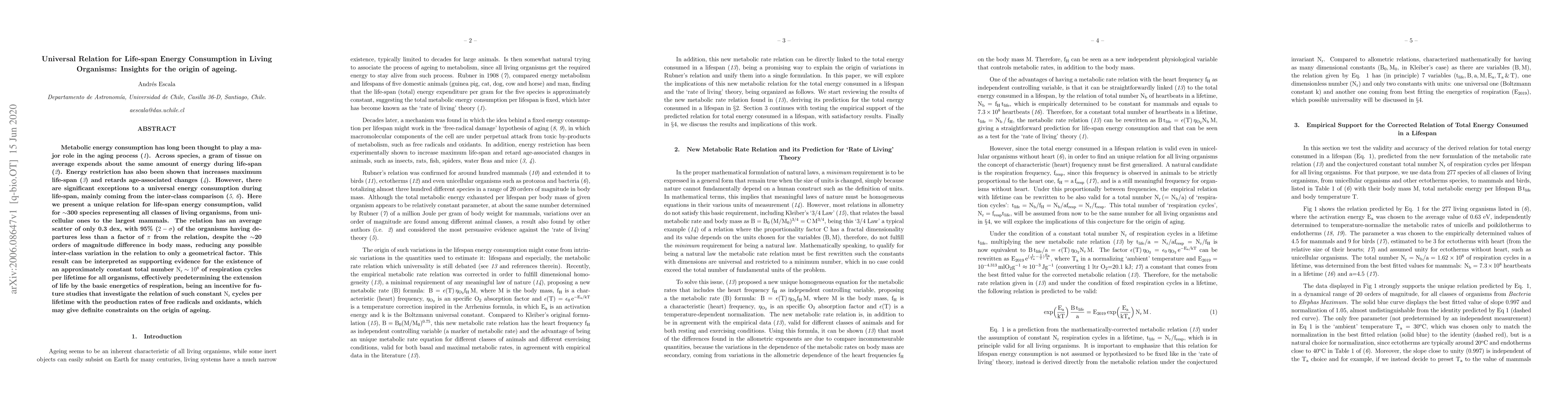 Metabolic energy consumption has long been thought to play a major role in the aging process ({\it 1}). Across species, a gram of tissue on average expends about the same amount of energy during life-span ({\it 2}). Energy restriction has also been shown that increases maximum life-span ({\it 3}) and retards age-associated changes ({\it 4}). However, there are significant exceptions to a universal energy consumption during life-span, mainly coming from the inter-class comparison ({\it 5, 6}). Here we present a unique relation for life-span energy consumption, valid for $\sim$300 species representing all classes of living organisms, from unicellular ones to the largest mammals. The relation has an average scatter of only 0.3 dex, with 95\% ($\rm 2-\sigma$) of the organisms having departures less than a factor of $\pi$ from the relation, despite the $\sim$20 orders of magnitude difference in body mass, reducing any possible inter-class variation in the relation to only a geometrical factor. This result can be interpreted as supporting evidence for the existence of an approximately constant total number $\rm N_r \sim 10^8$ of respiration cycles per lifetime for all organisms, effectively predetermining the extension of life by the basic energetics of respiration, being an incentive for future studies that investigate the relation of such constant $\rm N_r$ cycles per lifetime with the production rates of free radicals and oxidants, which may give definite constraints on the origin of ageing.