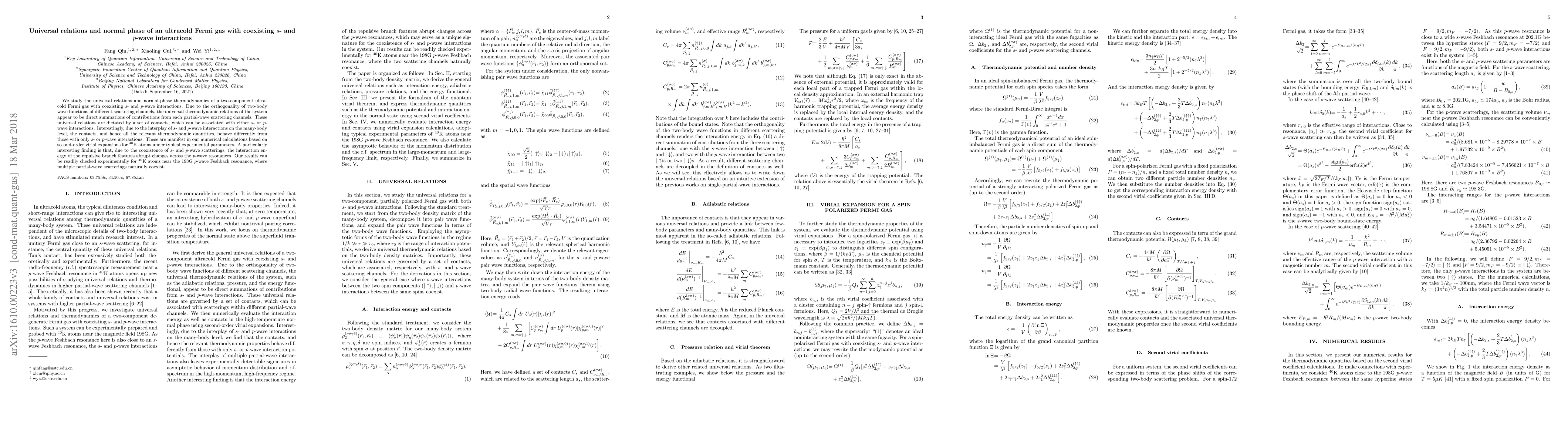 We study the universal relations and normal-phase thermodynamics of a two-component ultracold Fermi gas with coexisting $s$- and $p$-wave interactions. Due to the orthogonality of two-body wave functions of different scattering channels, the universal thermodynamic relations of the system appear to be direct summations of contributions from each partial-wave scattering channels. These universal relations are dictated by a set of contacts, which can be associated with either $s$- or $p$-wave interactions. Interestingly, due to the interplay of $s$- and $p$-wave interactions on the many-body level, the contacts, and hence all the relevant thermodynamic quantities, behave differently from those with only $s$- or $p$-wave interactions. These are manifest in our numerical calculations based on second-order virial expansions for $^{40}$K atoms under typical experimental parameters. A particularly interesting finding is that, due to the coexistence of $s$- and $p$-wave scatterings, the interaction energy of the repulsive branch features abrupt changes across the $p$-wave resonances. Our results can be readily checked experimentally for $^{40}$K atoms near the $198$G $p$-wave Feshbach resonance, where multiple partial-wave scatterings naturally coexist.