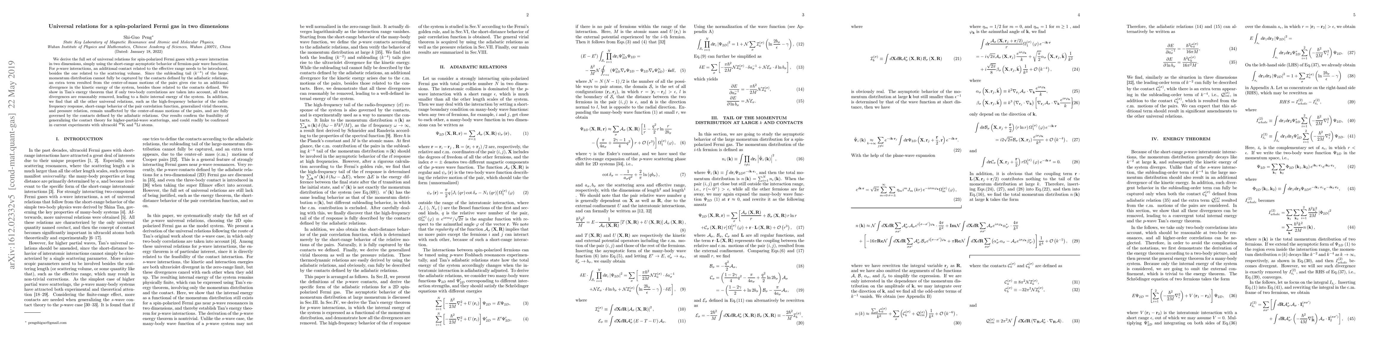 We derive the full set of universal relations for spin-polarized Fermi gases with $p$-wave interaction in two dimensions, simply using the short-range asymptotic behavior of fermion-pair wave functions. For $p$-wave interactions, an additional contact related to the effective range needs to be introduced, besides the one related to the scattering volume. Since the subleading tail ($k^{-4}$) of the large-momentum distribution cannot fully be captured by the contacts defined by the adiabatic relations, an extra term resulted from the center-of-mass motions of the pairs gives rise to an additional divergence in the kinetic energy of the system, besides those related to the contacts defined. We show in Tan's energy theorem that if only two-body correlations are taken into account, all these divergences are reasonably removed, leading to a finite internal energy of the system. In addition, we find that all the other universal relations, such as the high-frequency behavior of the radio-frequency response, short-range behavior of the pair correlation function, generalized virial theorem, and pressure relation, remain unaffected by the center-of-mass motions of the pairs, and are fully governed by the contacts defined by the adiabatic relations. Our results confirm the feasibility of generalizing the contact theory for higher-partial-wave scatterings, and could readily be confirmed in current experiments with ultracold $^{40}$K and $^{6}$Li atoms.