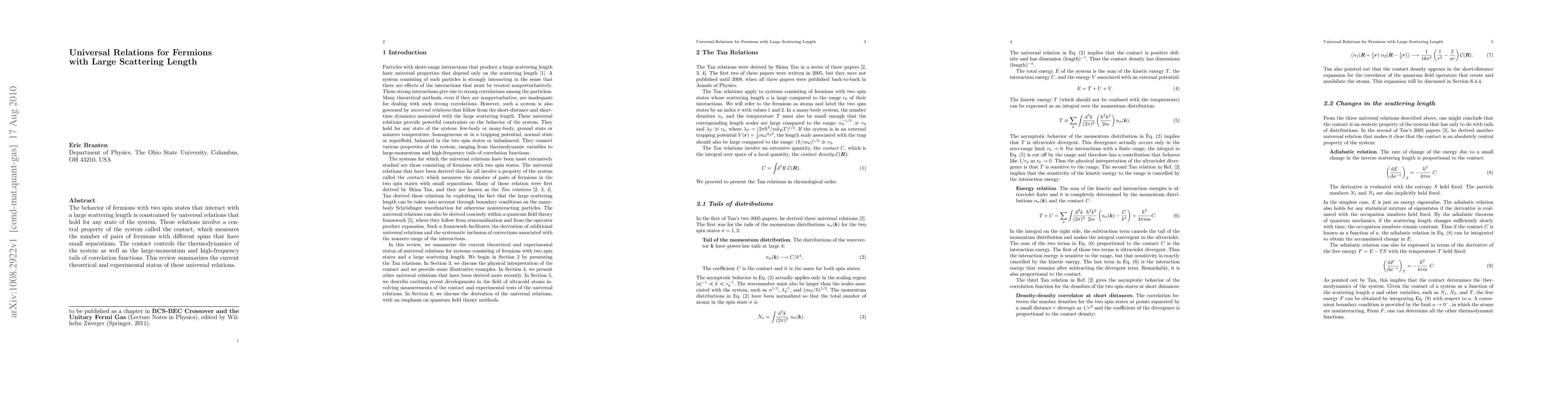 The behavior of fermions with two spin states that interact with a large scattering length is constrained by universal relations that hold for any state of the system. These relations involve a central property of the system called the contact, which measures the number of pairs of fermions with different spins that have small separations. The contact controls the thermodynamics of the system as well as the large-momentum and high-frequency tails of correlation functions. This review summarizes the current theoretical and experimental status of these universal relations.