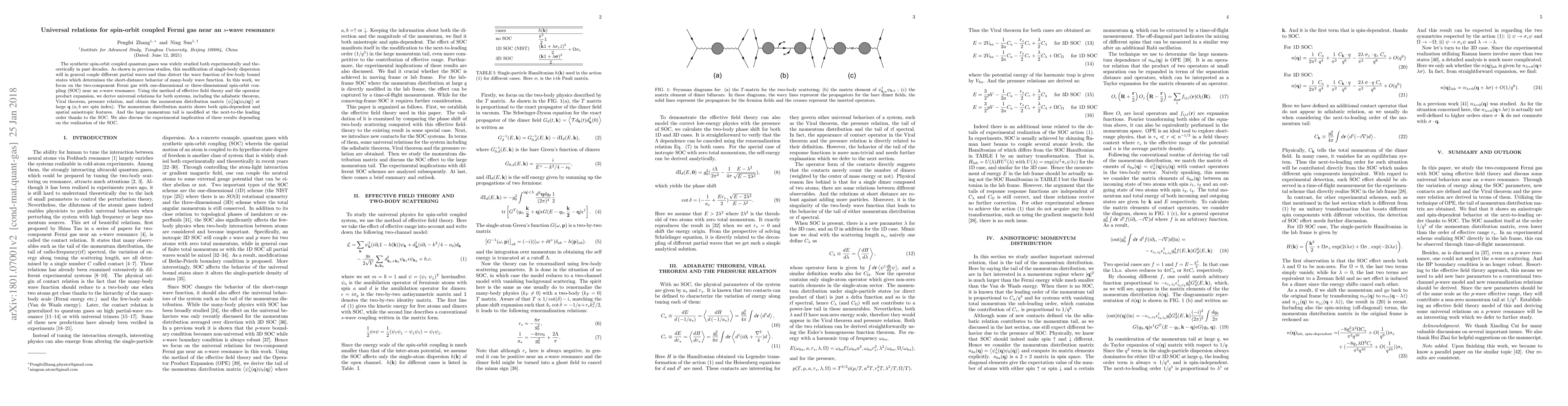 The synthetic spin-orbit coupled quantum gases is widely studied both experimentally and theoretically in recent years. As previous studies show, this modification of single-body dispersion will in general couple different partial waves and thus distort the wave-function of bound states which determines the short-distance behavior of many-body wave function. In this work, we focus on the two-component Fermi gas with one-dimensional or three-dimensional spin-orbit coupling near an s-wave resonance. Using the method of effective field theory and the operator product expansion, we derive universal relations for both systems, and obtain the momentum distribution matrix $\left<\psi^\dagger_a(\mathbf{q})\psi_b(\mathbf{q})\right>$ at large $\mathbf{q}$ ($a,b$ are spin index), which shows anisotropic features. We also discuss the experimental implication of these results depending on the realization of the spin-orbit coupling.