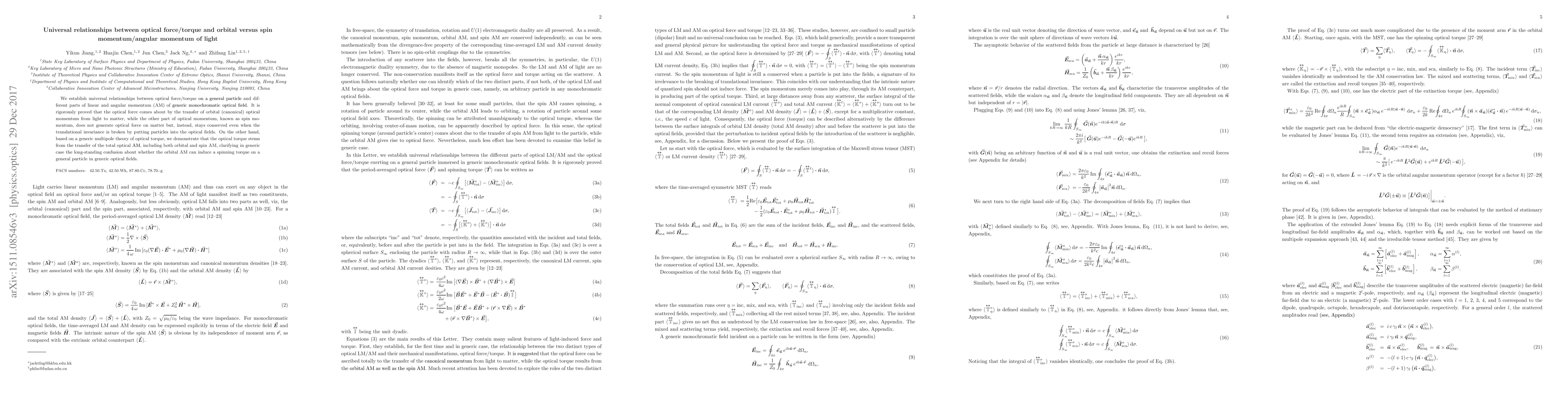 This paper establishes universal relationships between optical force/torque and the orbital versus spin momentum of light, proving that optical force arises from the transfer of orbital momentum while spin momentum remains conserved. It also clarifies that optical torque results from the transfer of total optical angular momentum, resolving confusion about orbital angular momentum's role in inducing spinning torque.