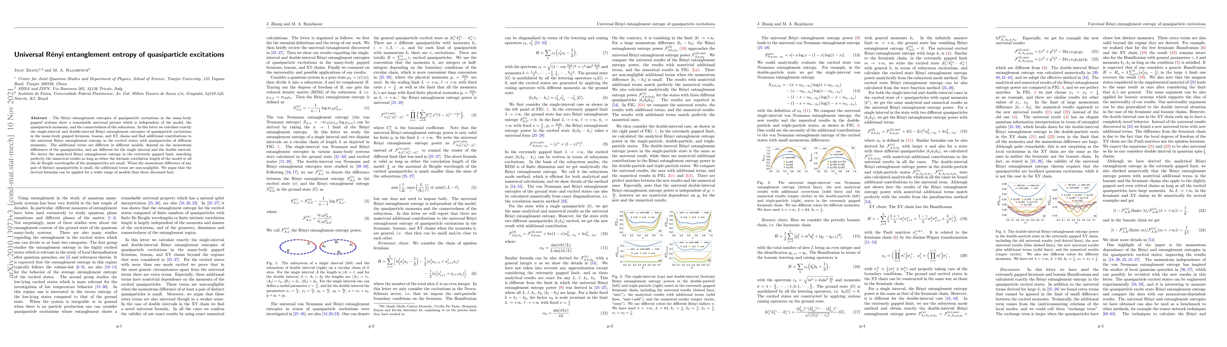 The R\'enyi entropies of quasiparticle excitations in the many-body gapped systems show a remarkable universal picture which can be understood partially by combination of a semiclassical argument with the quantum effect of (in)distinguishability. The universal R\'enyi entropies are independent of the model, the quasiparticle momenta, and the connectedness of the subsystem. In this letter we calculate exactly the single-interval and double-interval R\'enyi entropies of quasiparticle excitations in the many-body gapped fermions, bosons, and XY chains. We find additional contributions to the universal R\'enyi entropy in the excited states with quasiparticles of different momenta. The additional terms are different in the fermionic and bosonic chains, depend on the momentum differences of the quasiparticles, and are different for the single interval and the double interval. We derive the analytical R\'enyi entropy in the extremely gapped limit, matching perfectly the numerical results as long as either the intrinsic correlation length of the model or all the de Broglie wavelengths of the quasiparticles are small. When the momentum difference of any pair of distinct quasiparticles is small, the additional terms are non-negligible. On the contrary, when the difference of the momenta of each pair of distinct quasiparticles is large, the additional terms could be neglected. The universal single-interval R\'enyi entropy and its additional terms in the XY chain are the same as those in the fermionic chain, while the universal R\'enyi entropy of the double intervals and its additional terms are different, due to the fact that the local degrees of freedom of the XY chain are the Pauli matrices not the spinless fermions. We argue that the derived formulas have universal properties and can be applied for a wider range of models than those discussed here.