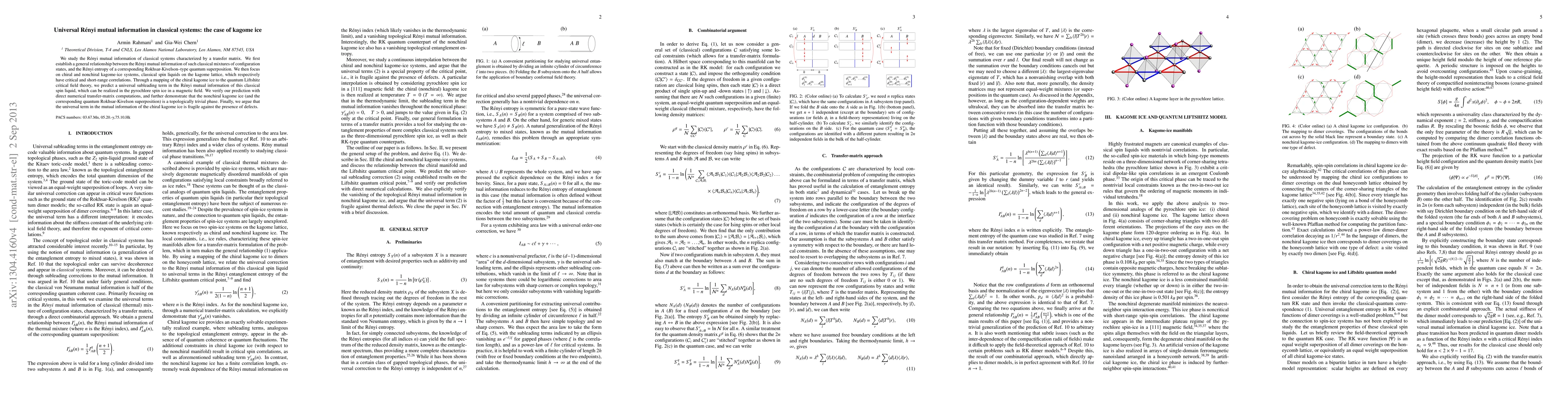 This paper investigates the Renyi mutual information in classical kagome-ice systems and establishes a connection between it and the Renyi entropy of quantum superpositions. It predicts a universal subleading term in the Renyi mutual information for chiral kagome ice, verified through numerical computations, and shows that nonchiral kagome ice is topologically trivial.