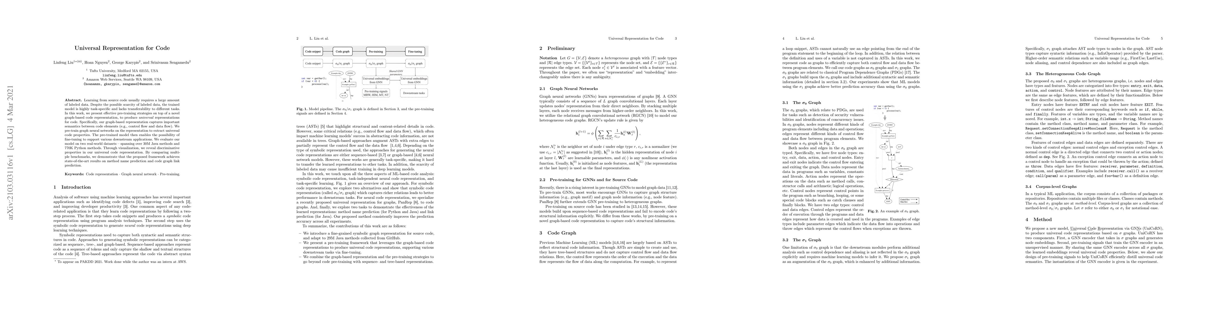 This paper introduces a novel graph-based representation for source code and pre-training strategies to create universal code representations. The proposed model captures code semantics and achieves state-of-the-art results in method name prediction and code graph link prediction, demonstrating improved transferability across different programming tasks.