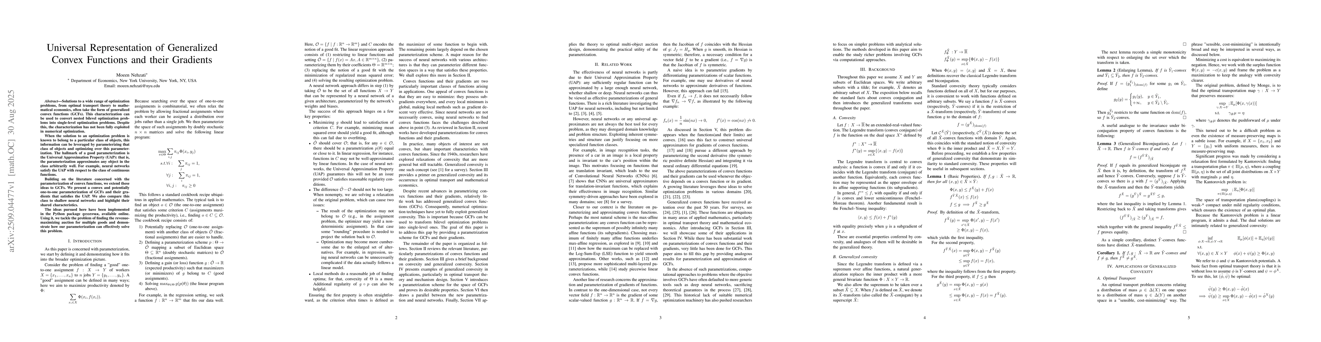 Solutions to a wide range of optimization problems, from optimal transport theory to mathematical economics, often take the form of generalized convex functions (GCFs). This characterization can be used to convert nested bilevel optimization problems into single-level optimization problems. Despite this, the characterization has not been fully exploited in numerical optimization. When the solution to an optimization problem is known to belong to a particular class of objects, this information can be leveraged by parameterizing that class of objects and optimizing over this parameterization. The hallmark of a good parameterization is the Universal Approximation Property (UAP): that is, the parameterization approximates any object in the class arbitrarily well. For example, neural networks satisfy the UAP with respect to the class of continuous functions. Building on the literature concerned with the parameterization of convex functions, we extend these ideas to GCFs. We present a convex and potentially one-to-one parameterization of GCFs and their gradients that satisfies the UAP. We also compare this class to shallow neural networks and highlight their shared characteristics. The ideas pursued here have been implemented in the Python package \href{https://github.com/MoeenNehzati/gconvex}{\texttt{gconvex}}, available online. Using it, we tackle the problem of finding the revenue-maximizing auction for multiple goods and demonstrate how our parameterization can effectively solve this problem.