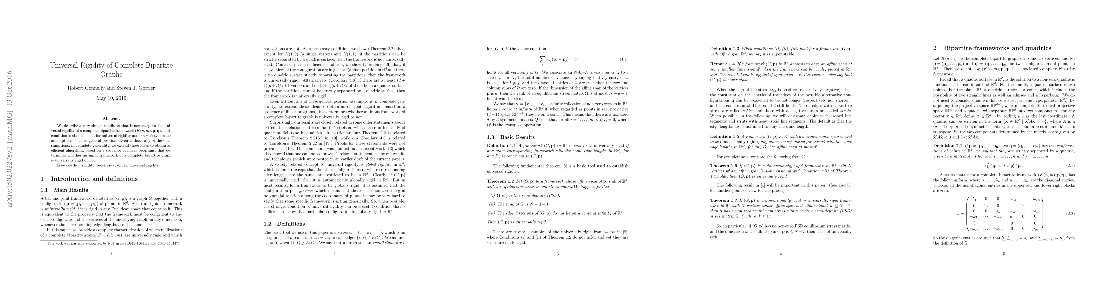 We describe a very simple condition that is necessary for the universal rigidity of a complete bipartite framework $(K(n,m),p,q)$. This condition is also sufficient for universal rigidity under a variety of weak assumptions, such as general position. Even without any of these assumptions, in complete generality, we extend these ideas to obtain an efficient algorithm, based on a sequence of linear programs, that determines whether an input framework of a complete bipartite graph is universally rigid or not.