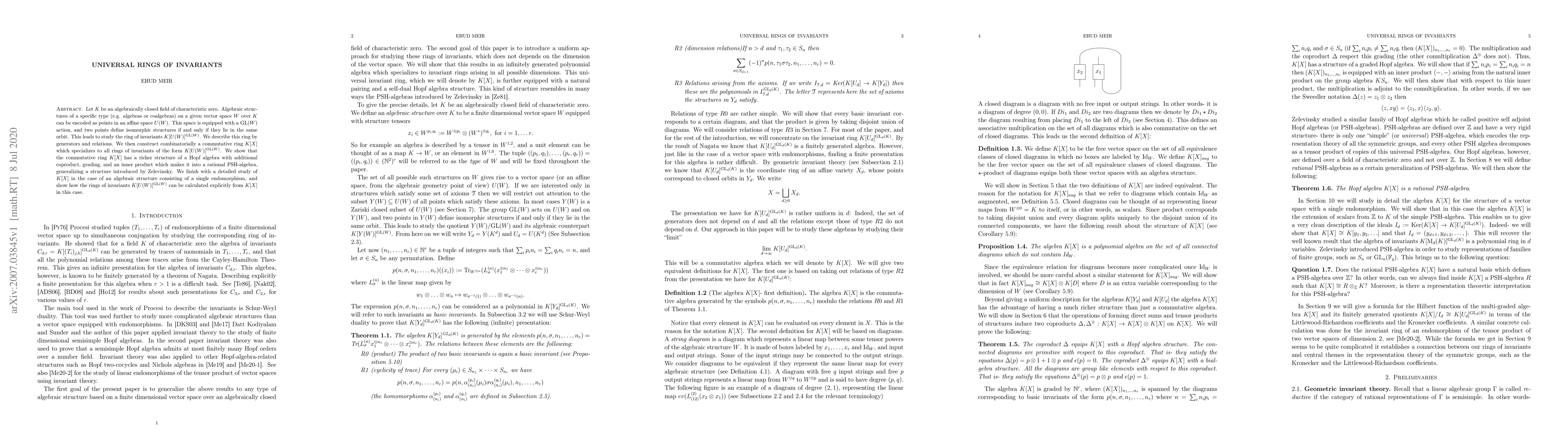 Let $K$ be an algebraically closed field of characteristic zero. Algebraic structures of a specific type (e.g. algebras or coalgebras) on a given vector space $W$ over $K$ can be encoded as points in an affine space $U(W)$. This space is equipped with a $\text{GL}(W)$ action, and two points define isomorphic structures if and only if they lie in the same orbit. This leads to study the ring of invariants $K[U(W)]^{\text{GL}(W)}$. We describe this ring by generators and relations. We then construct combinatorially a commutative ring $K[X]$ which specializes to all rings of invariants of the form $K[U(W)]^{\text{GL}(W)}$. We show that the commutative ring $K[X]$ has a richer structure of a Hopf algebra with additional coproduct, grading, and an inner product which makes it into a rational PSH-algebra, generalizing a structure introduced by Zelevinsky. We finish with a detailed study of $K[X]$ in the case of an algebraic structure consisting of a single endomorphism, and show how the rings of invariants $K[U(W)]^{\text{GL}(W)}$ can be calculated explicitly from $K[X]$ in this case.