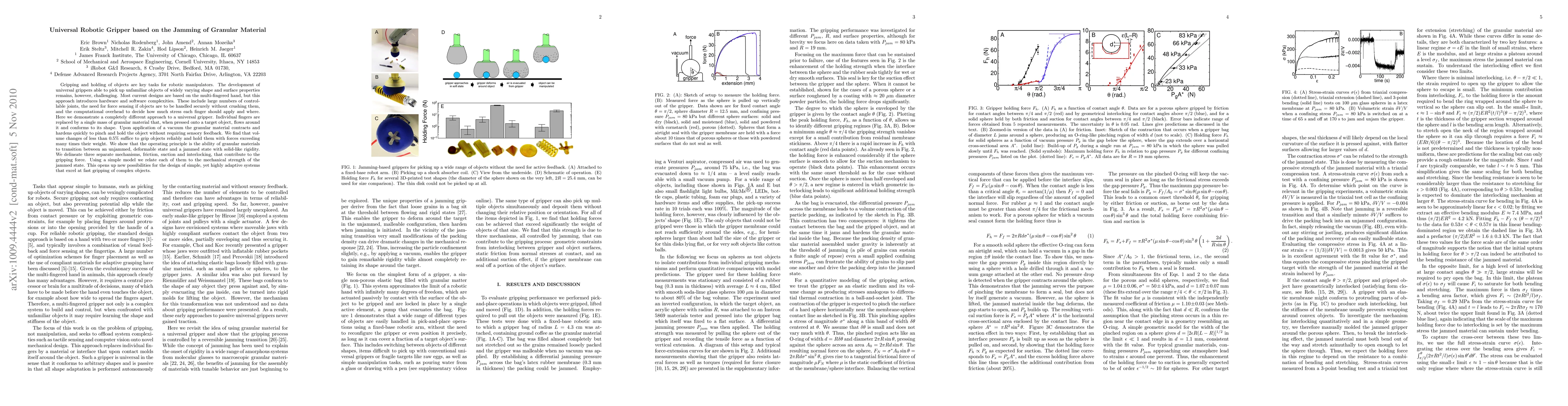 This paper presents a novel universal robotic gripper based on the jamming of granular material, which conforms to the shape of an object and grips it through friction, suction, and interlocking mechanisms. Unlike multi-fingered hands, this design eliminates hardware and software complexities, enabling reliable gripping with minimal volume changes and computational overhead.
