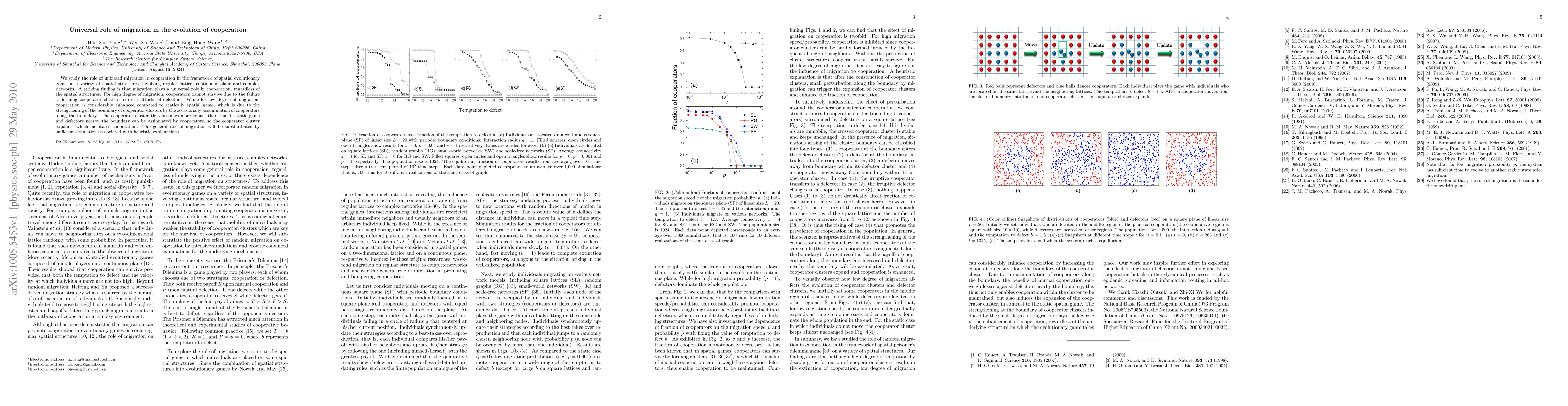 We study the role of unbiased migration in cooperation in the framework of spatial evolutionary game on a variety of spatial structures, involving regular lattice, continuous plane and complex networks. A striking finding is that migration plays a universal role in cooperation, regardless of the spatial structures. For high degree of migration, cooperators cannot survive due to the failure of forming cooperator clusters to resist attacks of defectors. While for low degree of migration, cooperation is considerably enhanced compared to statically spatial game, which is due to the strengthening of the boundary of cooperator clusters by the occasionally accumulation of cooperators along the boundary. The cooperator cluster thus becomes more robust than that in static game and defectors nearby the boundary can be assimilated by cooperators, so the cooperator cluster expands, which facilitates cooperation. The general role of migration will be substantiated by sufficient simulations associated with heuristic explanations.