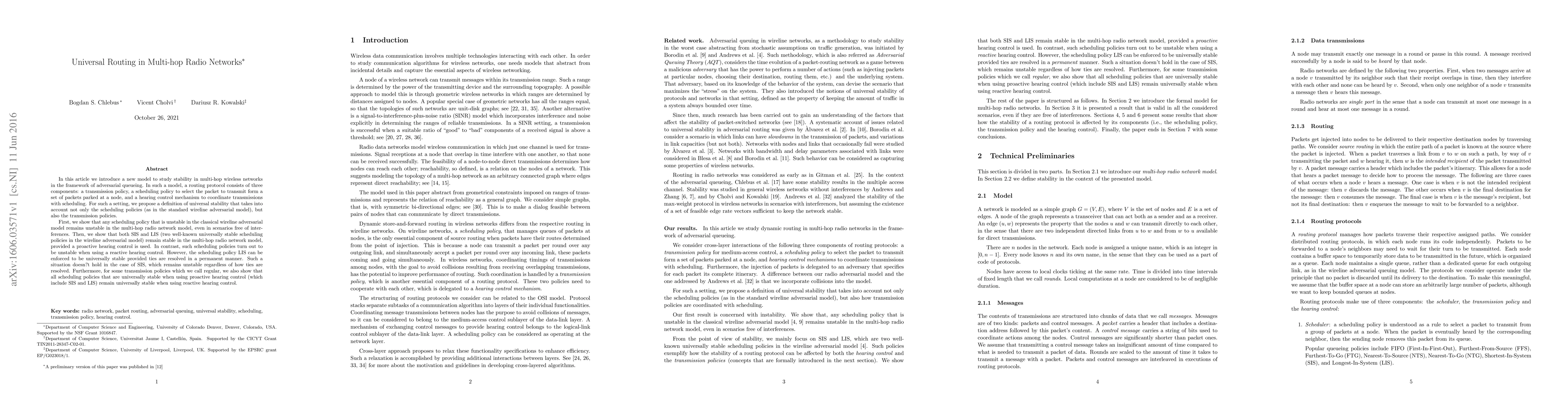 In this article we introduce a new model to study stability in multi-hop wireless networks in the framework of adversarial queueing. In such a model, a routing protocol consists of three components: a transmission policy, a scheduling policy to select the packet to transmit form a set of packets parked at a node, and a hearing control mechanism to coordinate transmissions with scheduling. For such a setting, we propose a definition of universal stability that takes into account not only the scheduling policies (as in the standard wireline adversarial model), but also the transmission policies. First, we show that any scheduling policy that is unstable in the classical wireline adversarial model remains unstable in the multi-hop radio network model, even in scenarios free of inter- ferences. Then, we show that both SIS and LIS (two well-known universally stable scheduling policies in the wireline adversarial model) remain stable in the multi-hop radio network model, provided a proactive hearing control is used. In contrast, such scheduling policies turn out to be unstable when using a reactive hearing control. However, the scheduling policy LIS can be enforced to be universally stable provided ties are resolved in a permanent manner. Such a situation doesn't hold in the case of SIS, which remains unstable regardless of how ties are resolved. Furthermore, for some transmission policies which we call regular, we also show that all scheduling policies that are universally stable when using proactive hearing control (which include SIS and LIS) remain universally stable when using reactive hearing control.