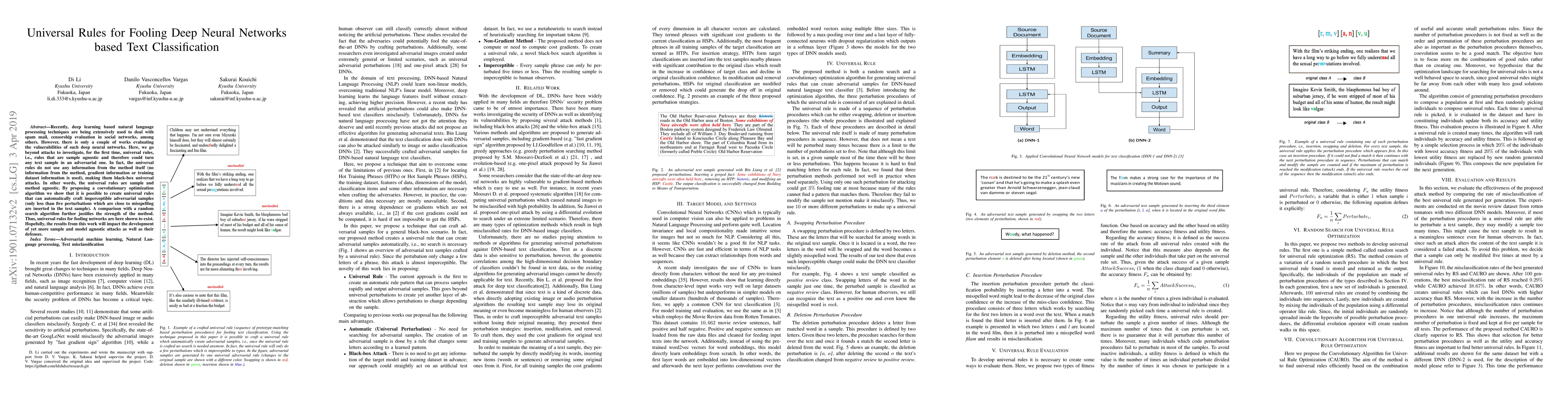 Recently, deep learning based natural language processing techniques are being extensively used to deal with spam mail, censorship evaluation in social networks, among others. However, there is only a couple of works evaluating the vulnerabilities of such deep neural networks. Here, we go beyond attacks to investigate, for the first time, universal rules, i.e., rules that are sample agnostic and therefore could turn any text sample in an adversarial one. In fact, the universal rules do not use any information from the method itself (no information from the method, gradient information or training dataset information is used), making them black-box universal attacks. In other words, the universal rules are sample and method agnostic. By proposing a coevolutionary optimization algorithm we show that it is possible to create universal rules that can automatically craft imperceptible adversarial samples (only less than five perturbations which are close to misspelling are inserted in the text sample). A comparison with a random search algorithm further justifies the strength of the method. Thus, universal rules for fooling networks are here shown to exist. Hopefully, the results from this work will impact the development of yet more sample and model agnostic attacks as well as their defenses, culminating in perhaps a new age for artificial intelligence.