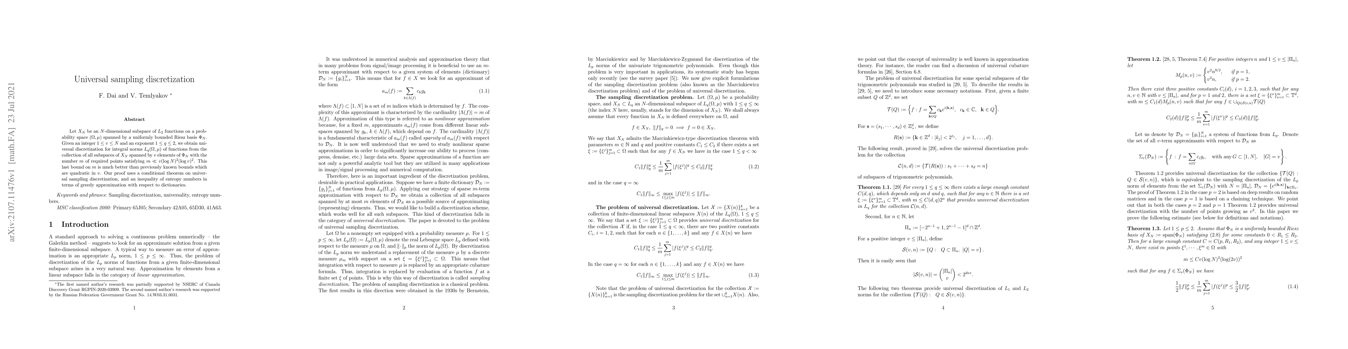 Let $X_N$ be an $N$-dimensional subspace of $L_2$ functions on a probability space $(\Omega, \mu)$ spanned by a uniformly bounded Riesz basis $\Phi_N$. Given an integer $1\leq v\leq N$ and an exponent $1\leq q\leq 2$, we obtain universal discretization for integral norms $L_q(\Omega,\mu)$ of functions from the collection of all subspaces of $X_N$ spanned by $v$ elements of $\Phi_N$ with the number $m$ of required points satisfying $m\ll v(\log N)^2(\log v)^2$. This last bound on $m$ is much better than previously known bounds which are quadratic in $v$. Our proof uses a conditional theorem on universal sampling discretization, and an inequality of entropy numbers in terms of greedy approximation with respect to dictionaries.