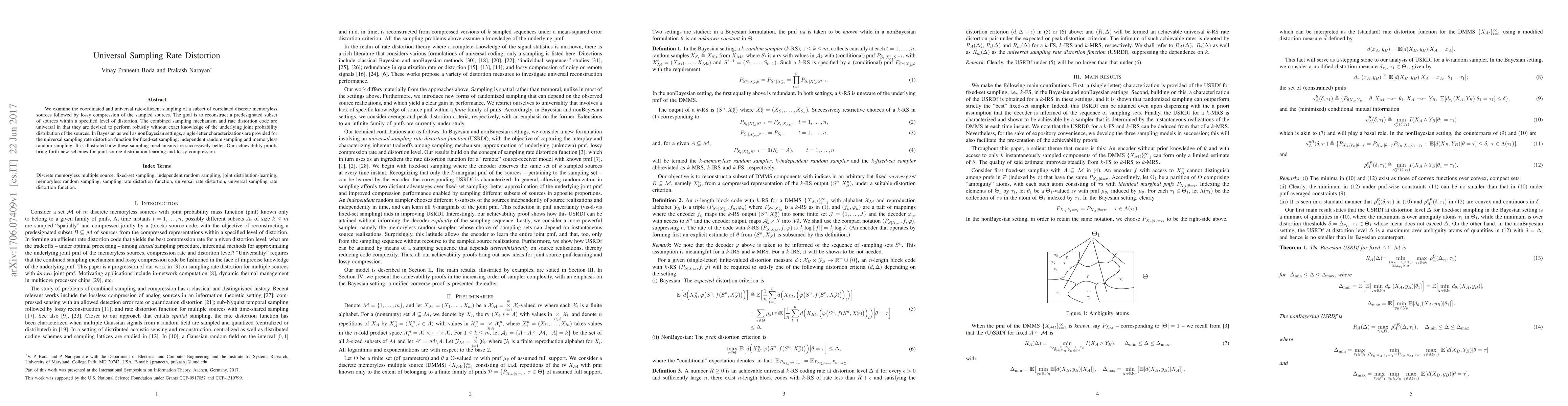 We examine the coordinated and universal rate-efficient sampling of a subset of correlated discrete memoryless sources followed by lossy compression of the sampled sources. The goal is to reconstruct a predesignated subset of sources within a specified level of distortion. The combined sampling mechanism and rate distortion code are universal in that they are devised to perform robustly without exact knowledge of the underlying joint probability distribution of the sources. In Bayesian as well as nonBayesian settings, single-letter characterizations are provided for the universal sampling rate distortion function for fixed-set sampling, independent random sampling and memoryless random sampling. It is illustrated how these sampling mechanisms are successively better. Our achievability proofs bring forth new schemes for joint source distribution-learning and lossy compression.