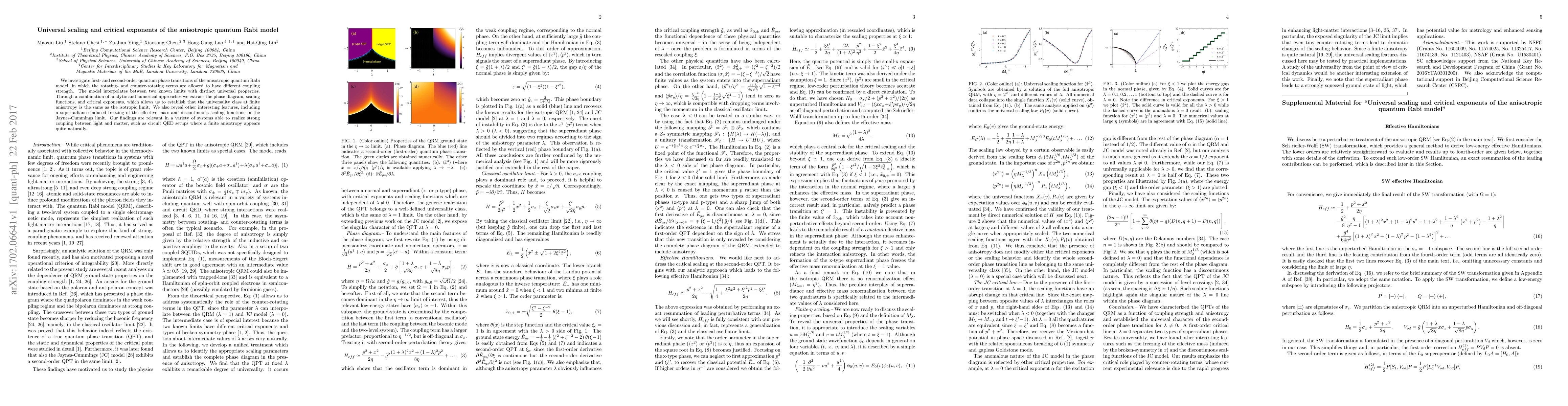 We investigate first- and second-order quantum phase transitions of the anisotropic quantum Rabi model, in which the rotating- and counter-rotating terms are allowed to have different coupling strength. The model interpolates between two known limits with distinct universal properties. Through a combination of analytic and numerical approaches we extract the phase diagram, scaling functions, and critical exponents, which allows us to establish that the universality class at finite? anisotropy is the same as the isotropic limit. We also reveal other interesting features, including a superradiance-induced freezing of the effective mass and discontinuous scaling functions in the Jaynes-Cummings limit. Our findings are relevant in a variety of systems able to realize strong coupling between light and matter, such as circuit QED setups where a finite anisotropy appears quite naturally.