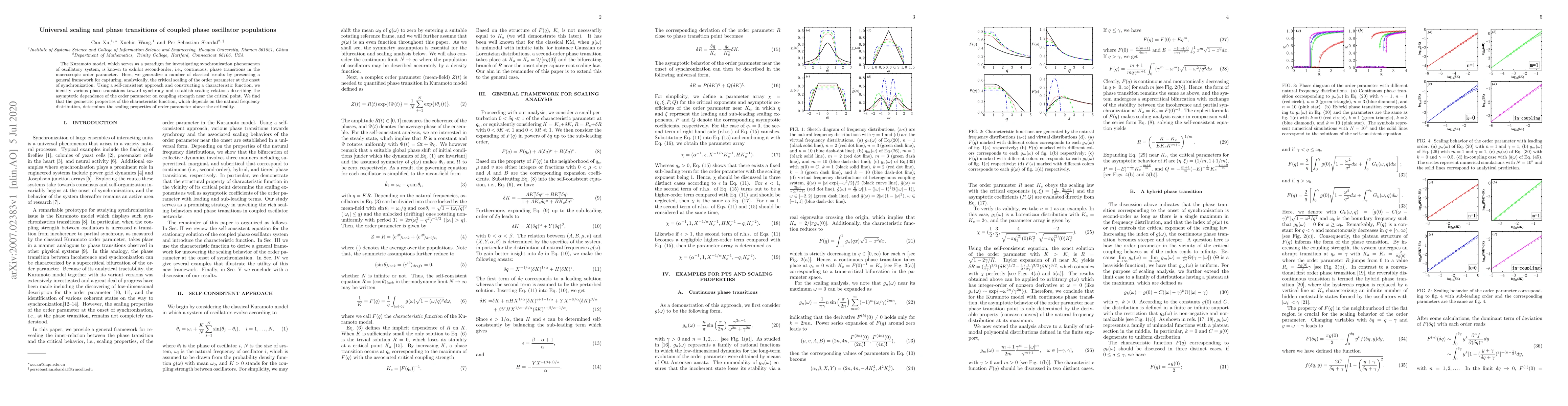 The Kuramoto model, which serves as a paradigm for investigating synchronization phenomenon of oscillatory system, is known to exhibit second-order, i.e., continuous, phase transitions in the macroscopic order parameter. Here, we generalize a number of classical results by presenting a general framework for capturing, analytically, the critical scaling of the order parameter at the onset of synchronization. Using a self-consistent approach and constructing a characteristic function, we identify various phase transitions toward synchrony and establish scaling relations describing the asymptotic dependence of the order parameter on coupling strength near the critical point. We find that the geometric properties of the characteristic function, which depends on the natural frequency distribution, determines the scaling properties of order parameter above the criticality.
