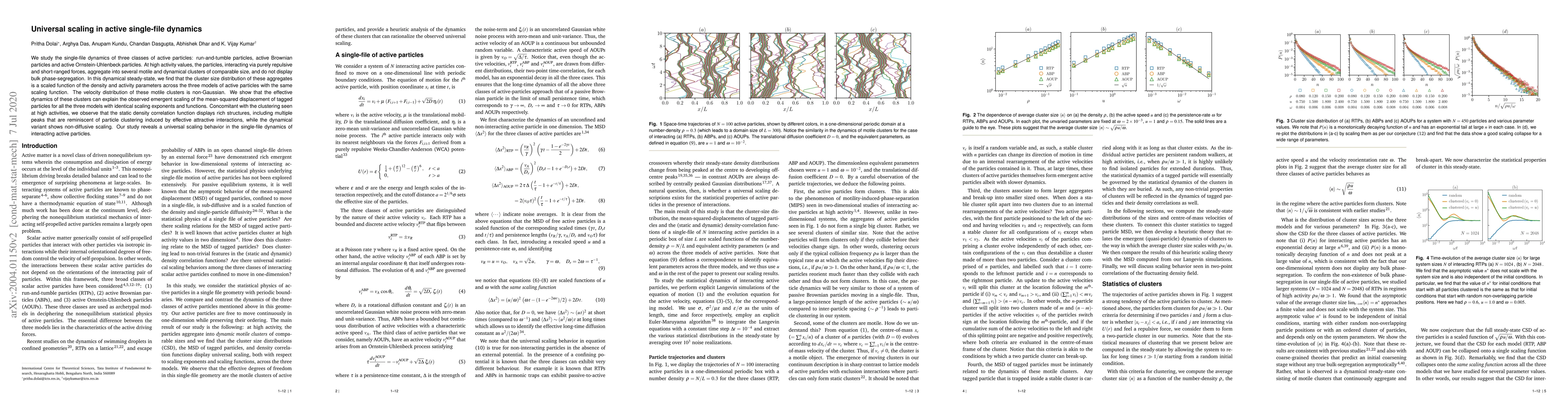 This paper investigates the dynamics of three types of active particles, finding that at high activity levels, they form clusters with a universal scaling behavior in cluster size distribution and mean-squared displacement, regardless of the particle model. The study reveals non-Gaussian velocity distributions and complex static density correlations, highlighting a universal scaling in active single-file dynamics.