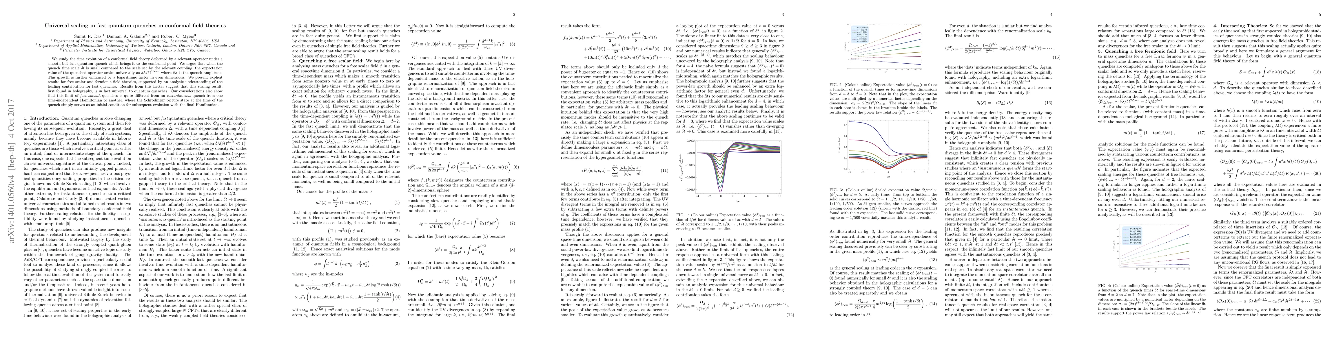 This paper explores the universal scaling behavior in fast quantum quenches in conformal field theories, demonstrating that the expectation value of the quenched operator scales as \(\delta g/ \delta t ^{2\Delta-d}\), enhanced by a logarithmic factor in even dimensions. The findings suggest this scaling is universal, differing from the dynamics of instantaneous quenches.