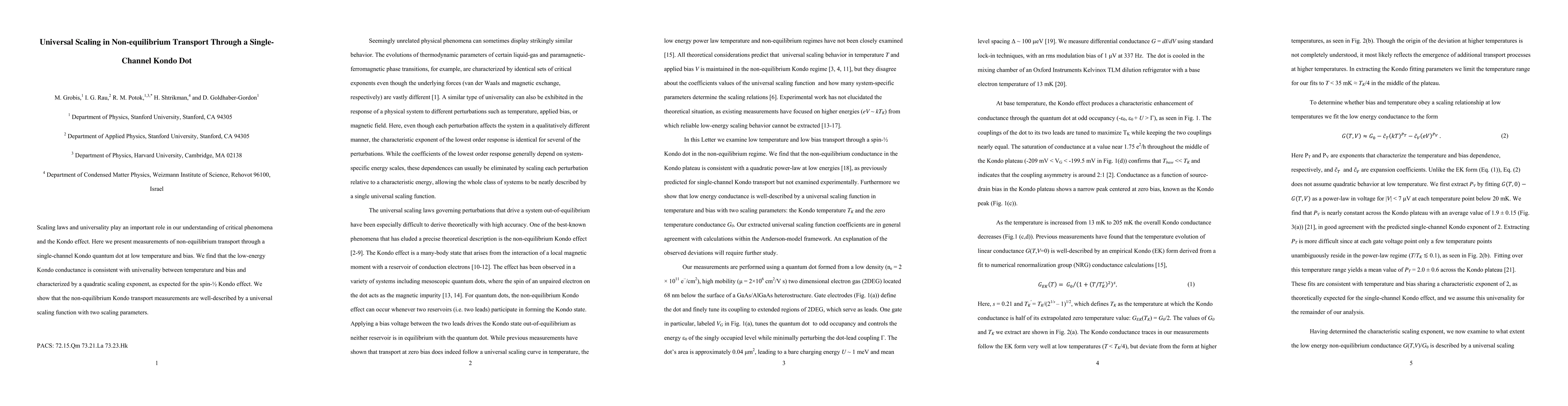 This paper investigates non-equilibrium transport through a single-channel Kondo quantum dot, revealing that the low-energy Kondo conductance adheres to universal scaling laws between temperature and bias, characterized by a quadratic scaling exponent typical of the spin-1/2 Kondo effect. The findings are well-described by a universal scaling function with two parameters.