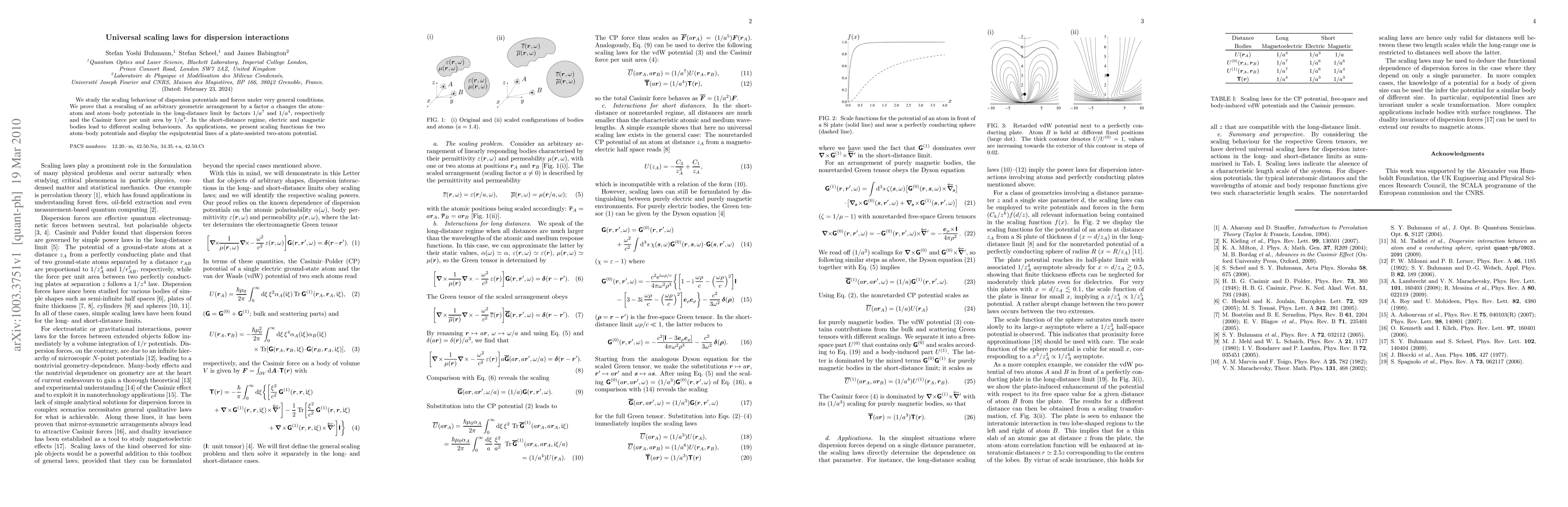 We study the scaling behaviour of dispersion potentials and forces under very general conditions. We prove that a rescaling of an arbitrary geometric arrangement by a factor a changes the atom-atom and atom-body potentials in the long-distance limit by factors 1/a^7 and 1/a^4, respectively and the Casimir force per unit area by 1/a^4. In the short-distance regime, electric and magnetic bodies lead to different scaling behaviours. As applications, we present scaling functions for two atom-body potentials and display the equipotential lines of a plate-assisted two-atom potential.