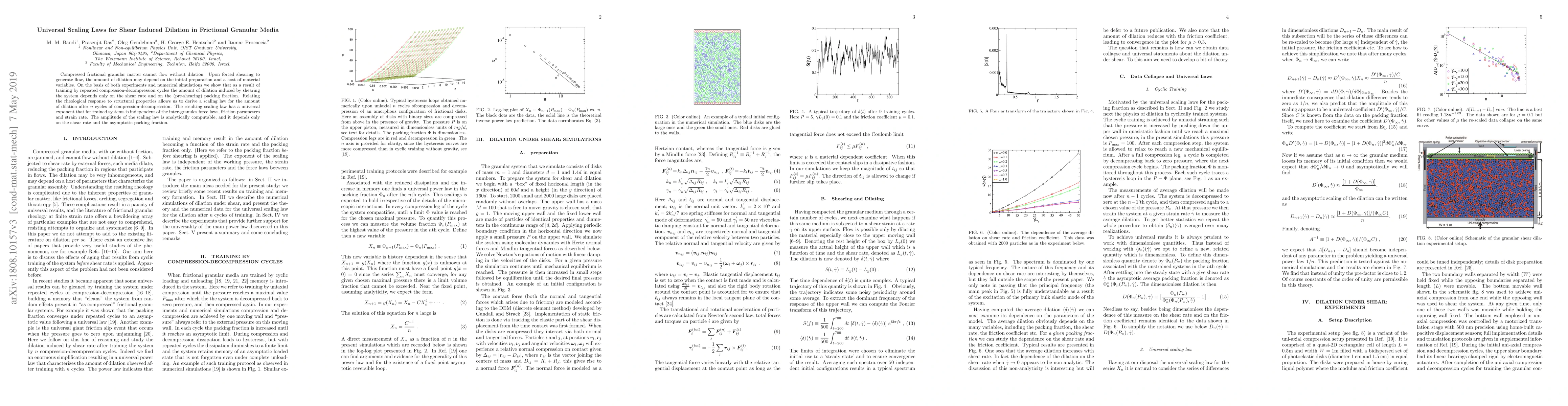 This paper demonstrates that shear-induced dilation in compressed frictional granular media follows universal scaling laws after training through repeated compression-decompression cycles. The dilation amount depends solely on the shear rate and packing fraction, revealing a universal exponent independent of material-specific parameters.