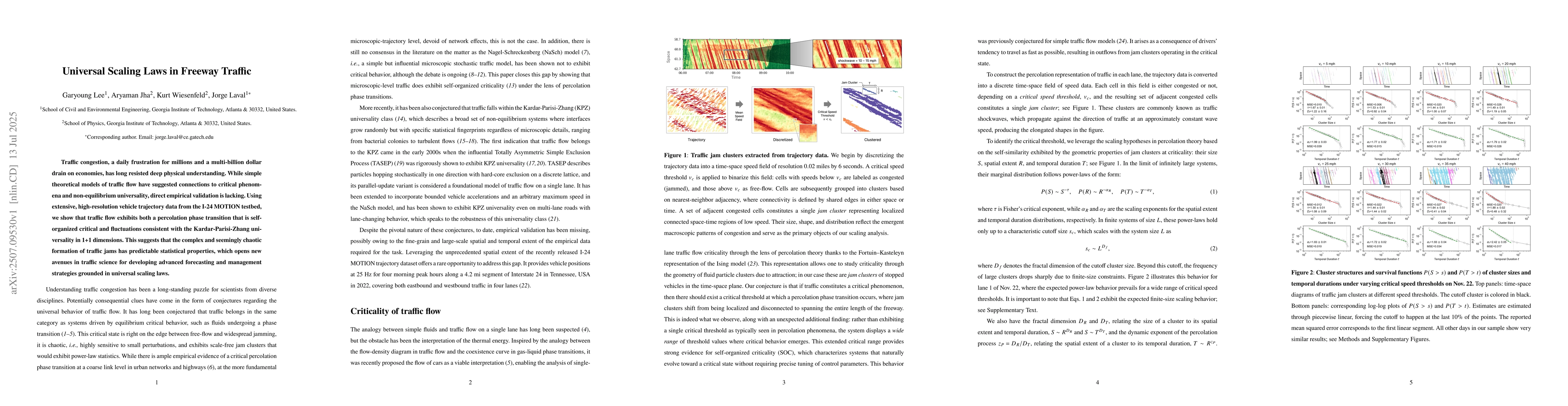 Traffic congestion, a daily frustration for millions and a multi-billion dollar drain on economies, has long resisted deep physical understanding. While simple theoretical models of traffic flow have suggested connections to critical phenomena and non-equilibrium universality, direct empirical validation is lacking. Using extensive, high-resolution vehicle trajectory data from the I-24 MOTION testbed, we show that traffic flow exhibits both a percolation phase transition that is self-organized critical and fluctuations consistent with the Kardar-Parisi-Zhang universality in 1+1 dimensions. This suggests that the complex and seemingly chaotic formation of traffic jams has predictable statistical properties, which opens new avenues in traffic science for developing advanced forecasting and management strategies grounded in universal scaling laws.